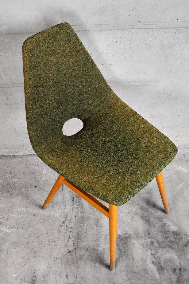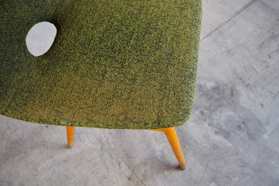 Our vintage green chair comes from Austria. Its green color is difficult to define since depending on the light, one shade of green or another predominates as a result of the use of different shades of green wool fibers. It even appears ochre in color from some angles.