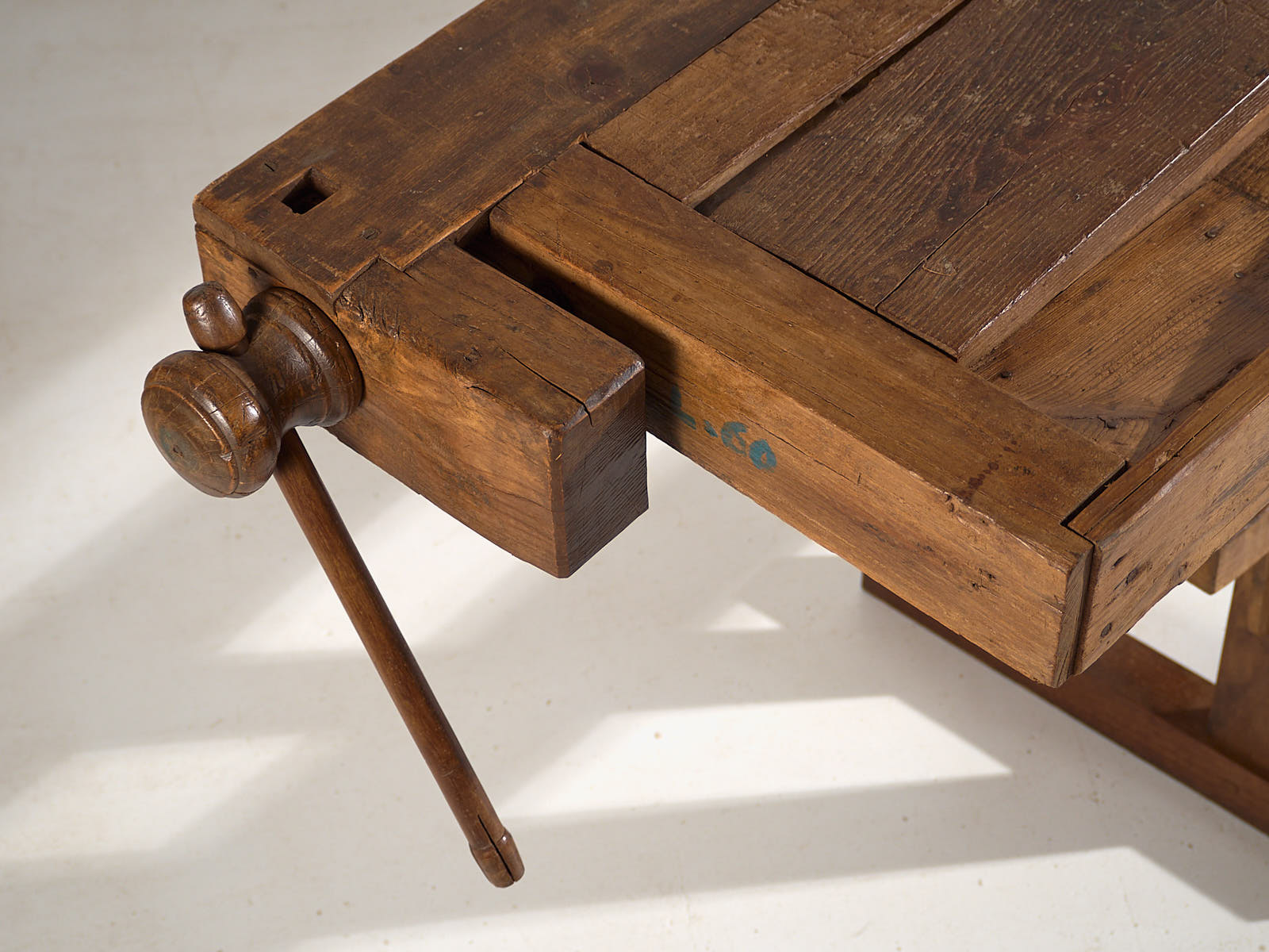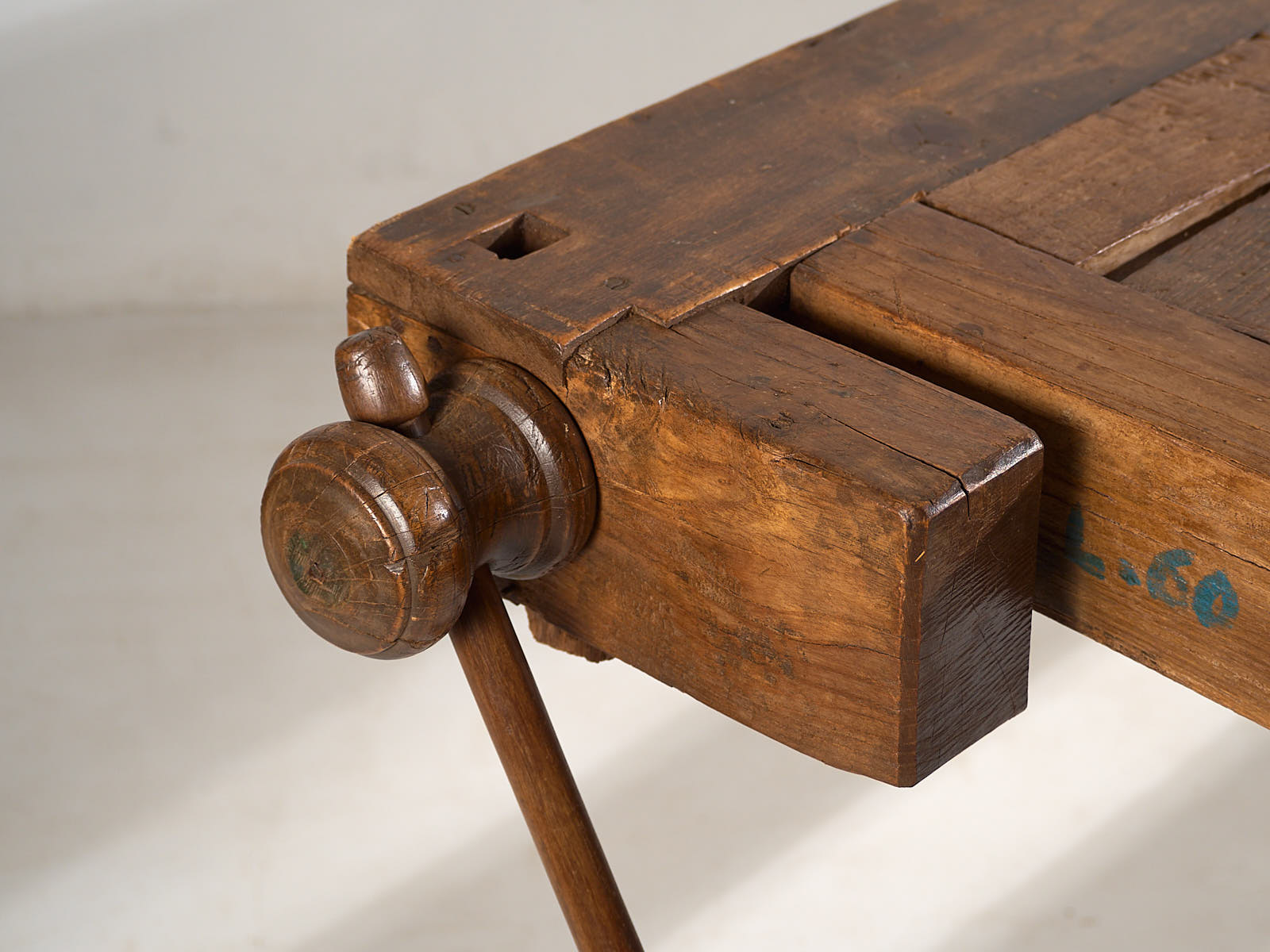 - The design of its side screw, an essential tool for clamping workpieces, and the multiple holes in the tabletop, designed to accommodate tools and improve material clamping.