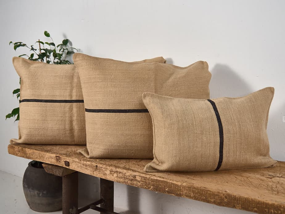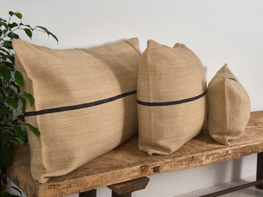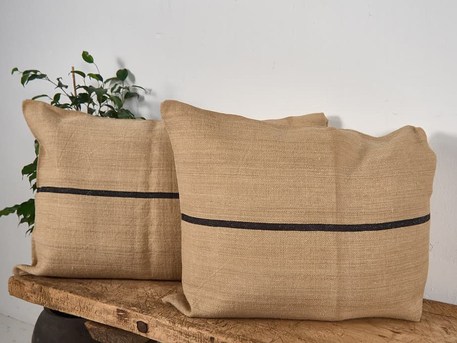Antique linen cushion with black stripes handmade from antique flour sacks.