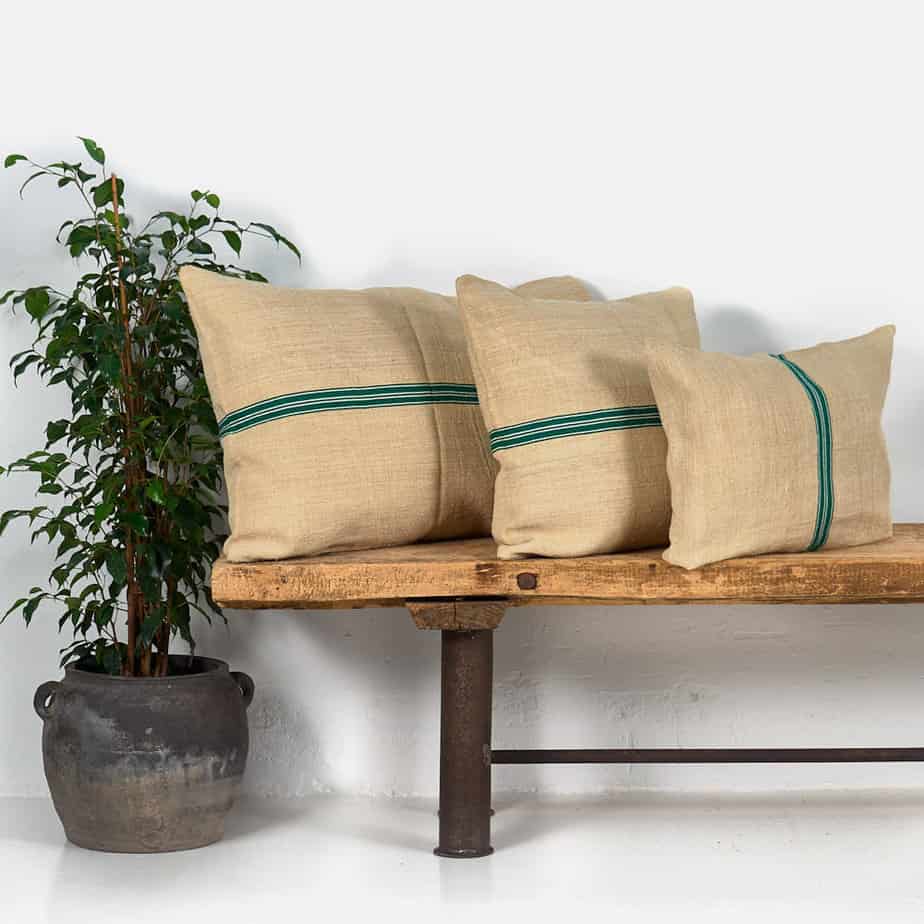 Antique linen cushion with blue stripes handmade from antique flour sacks.