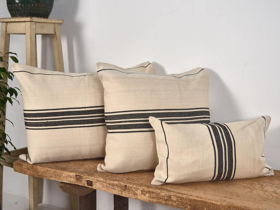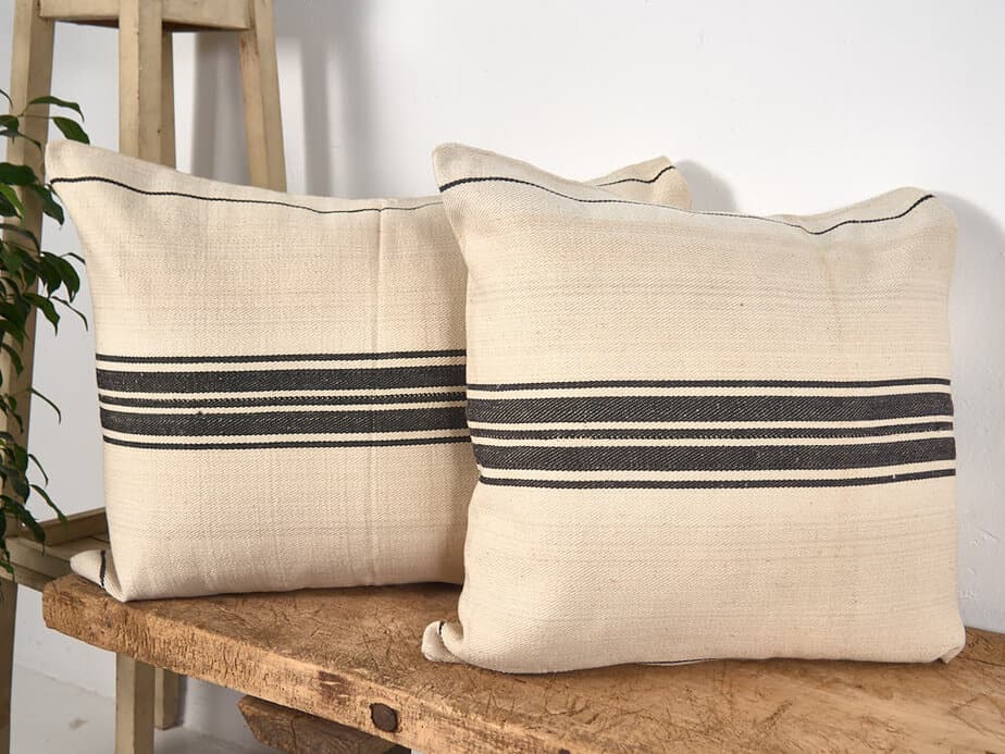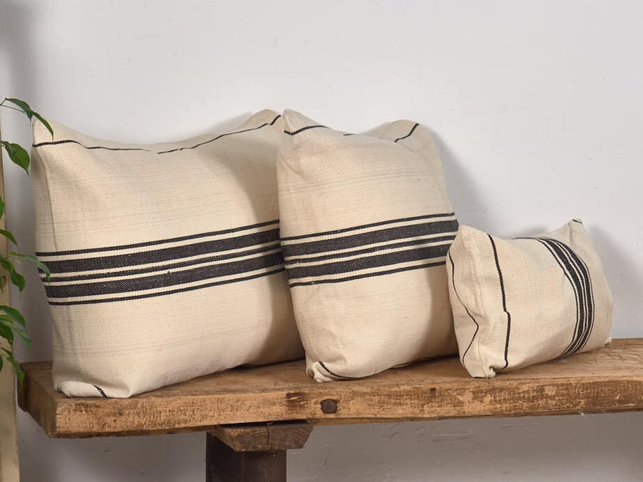 Antique natural linen cushion with black stripes handmade from antique flour sacks.
