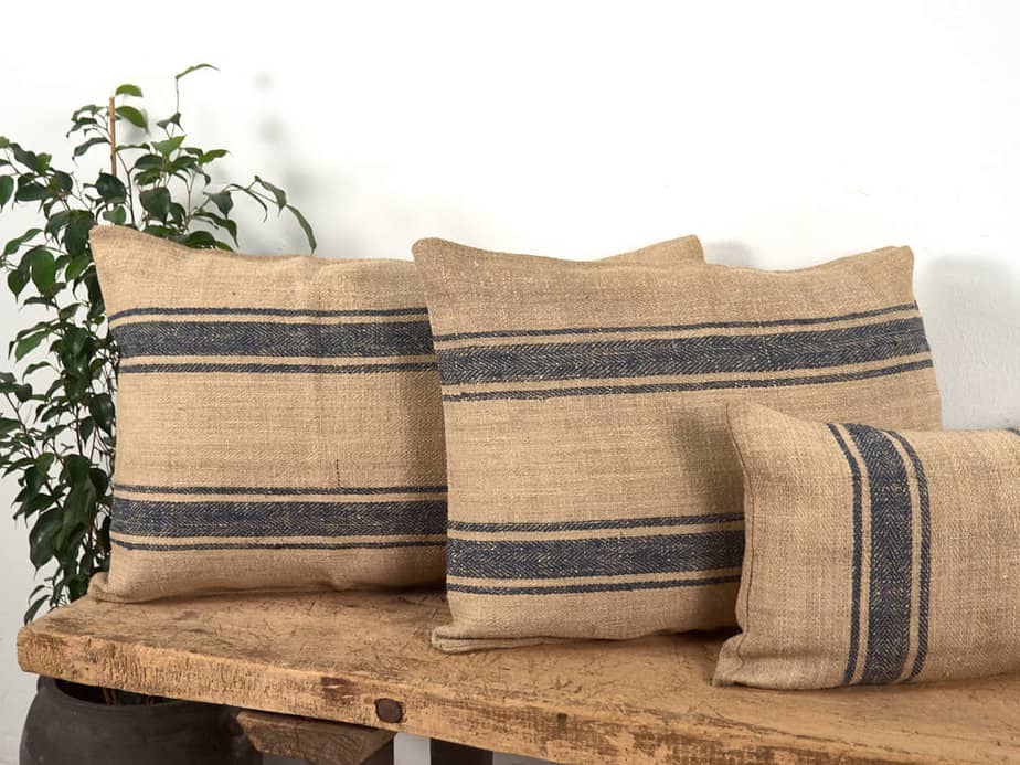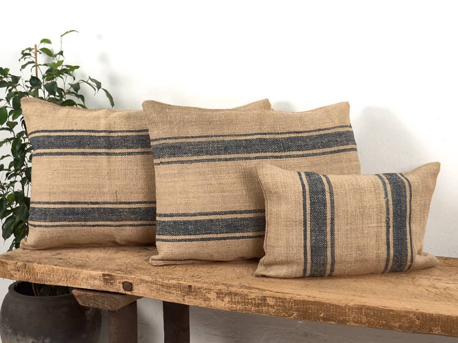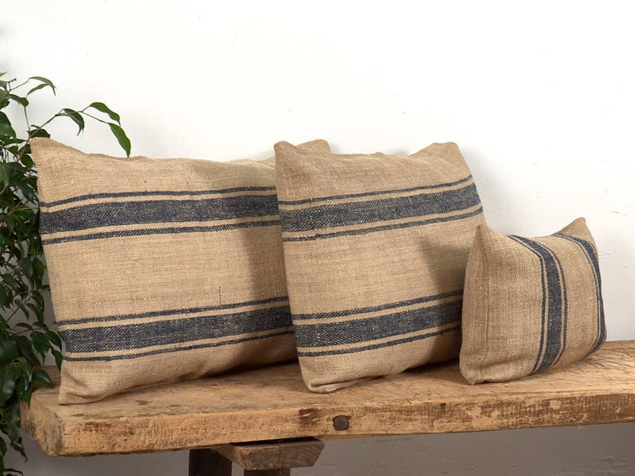 Antique linen cushion with cobalt blue stripes handmade with antique flour sacks.