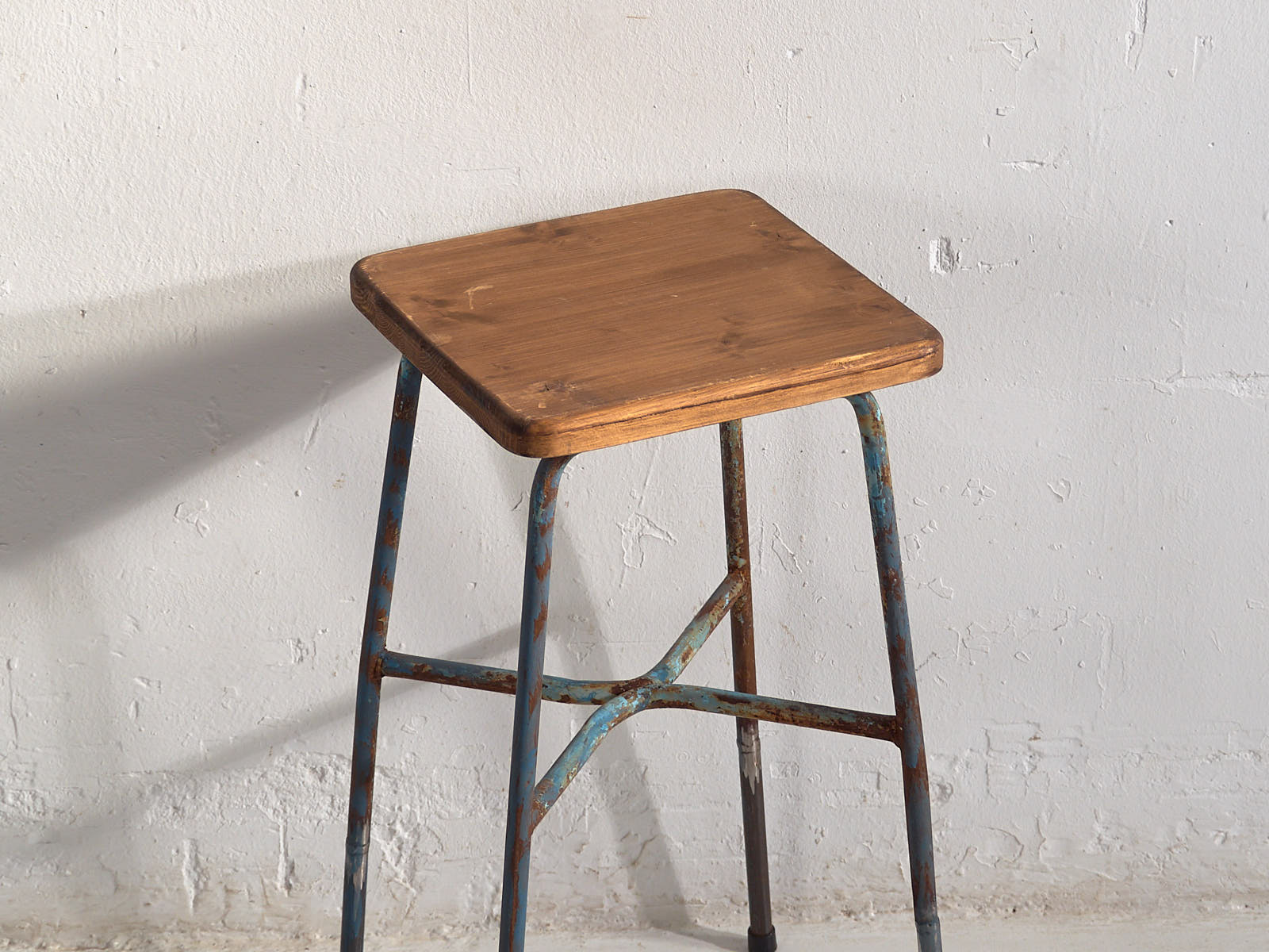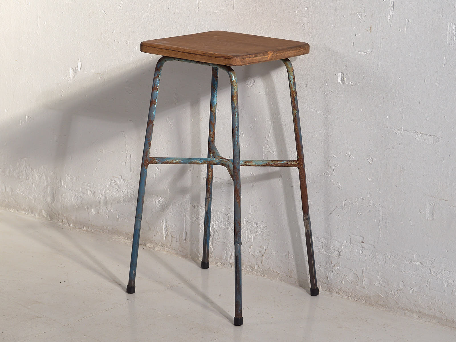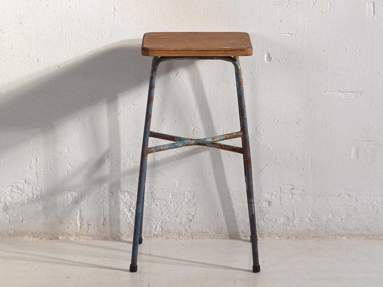 Originally this stool was a 50cm high stool, and the legs were lengthened to make it a 70cm stool. Moreover, the original seat was made of PP plastic and due to its state of conservation it was changed for a solid wood seat with an aging effect.