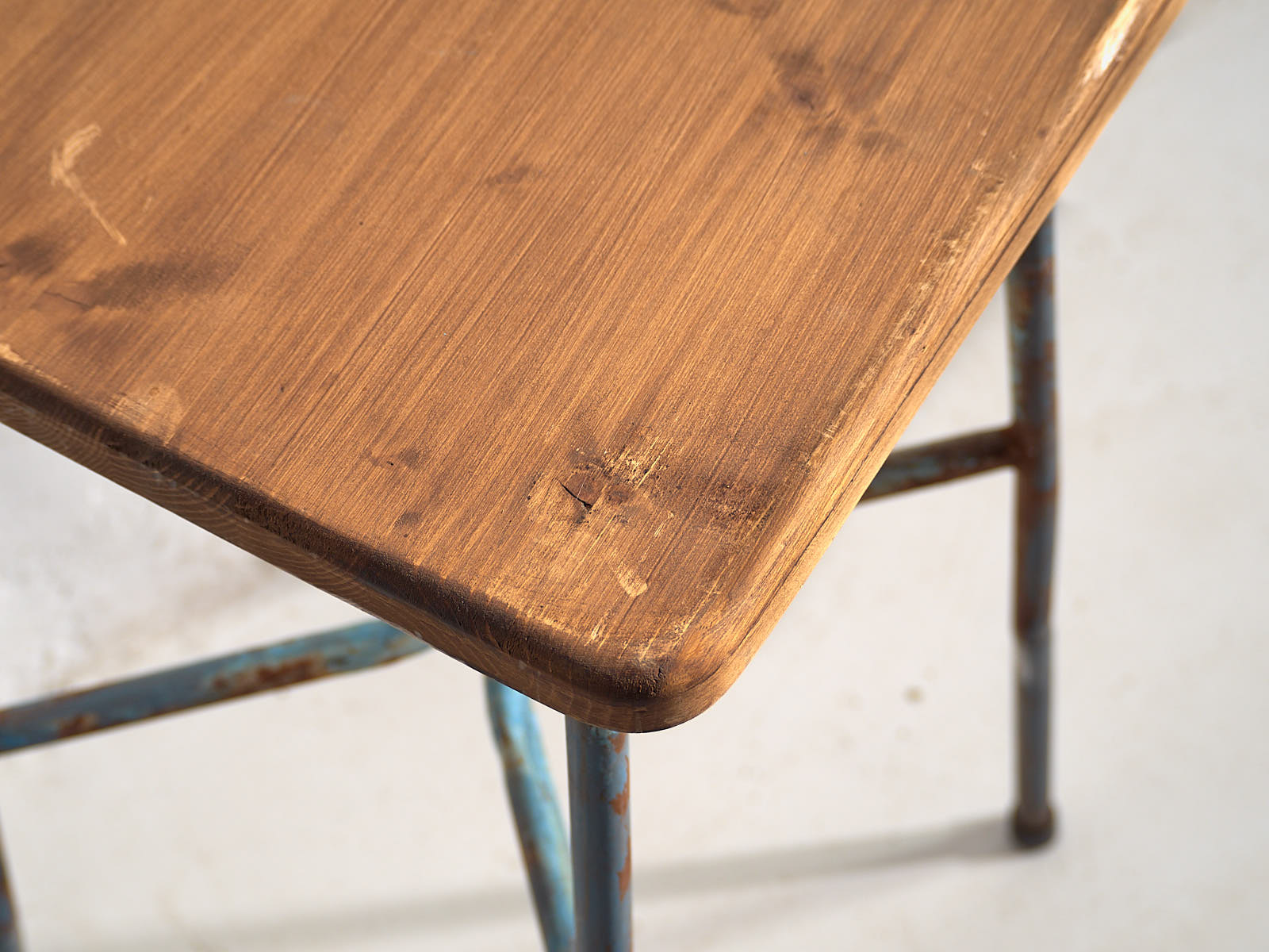 Vintage metal industrial style stool with metal legs and a 70cm high solid wood seat (France, c.1950).
