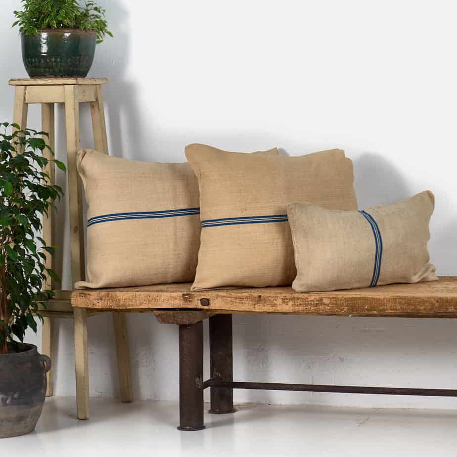 Coussin en lin ancien à rayures bleu marine, fabriqué à la main à partir d’anciens sacs de farine.