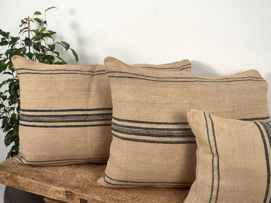 Coussin en lin ancien à rayures bleu marine, fabriqué à la main à partir d’anciens sacs de farine.