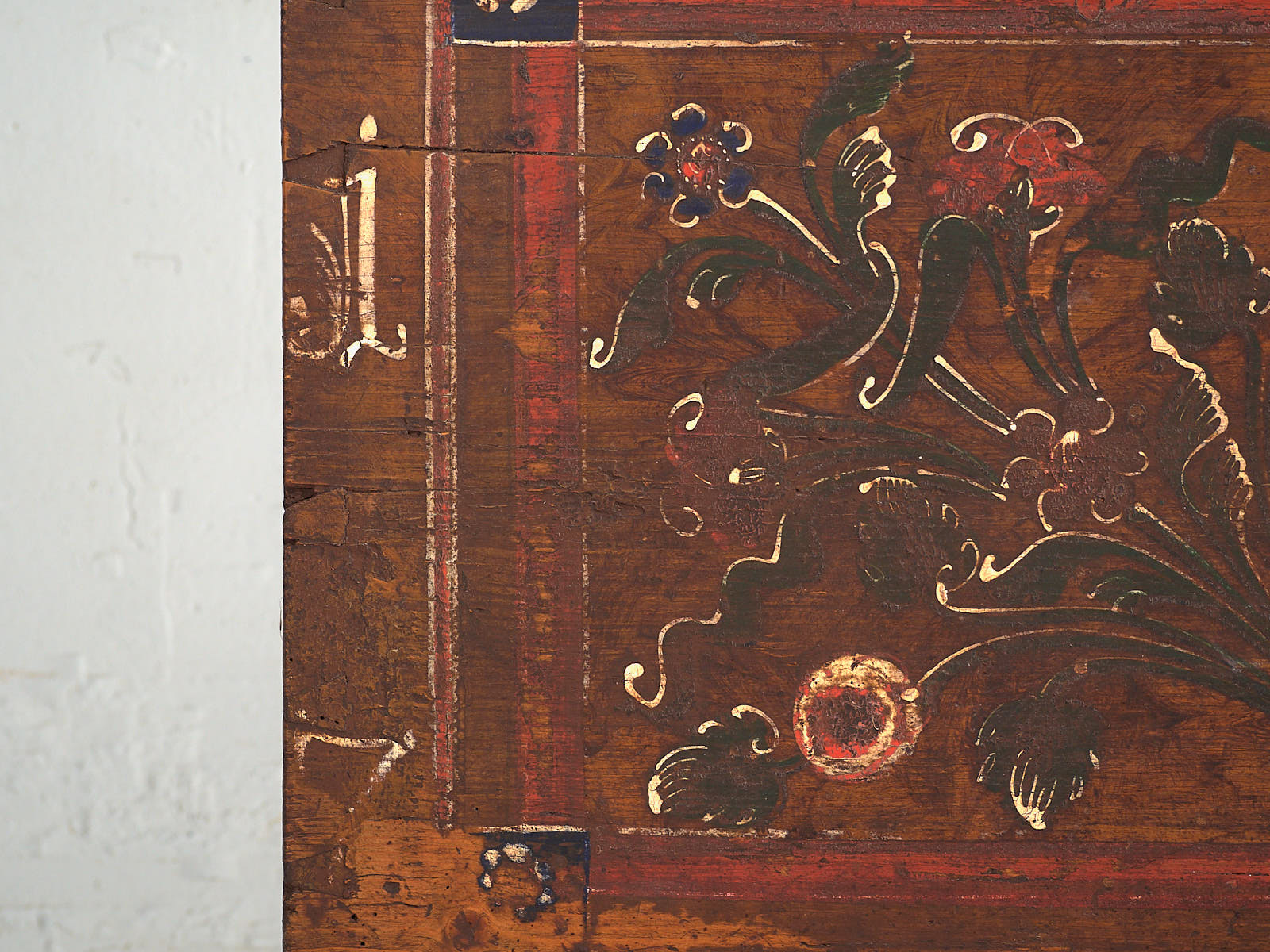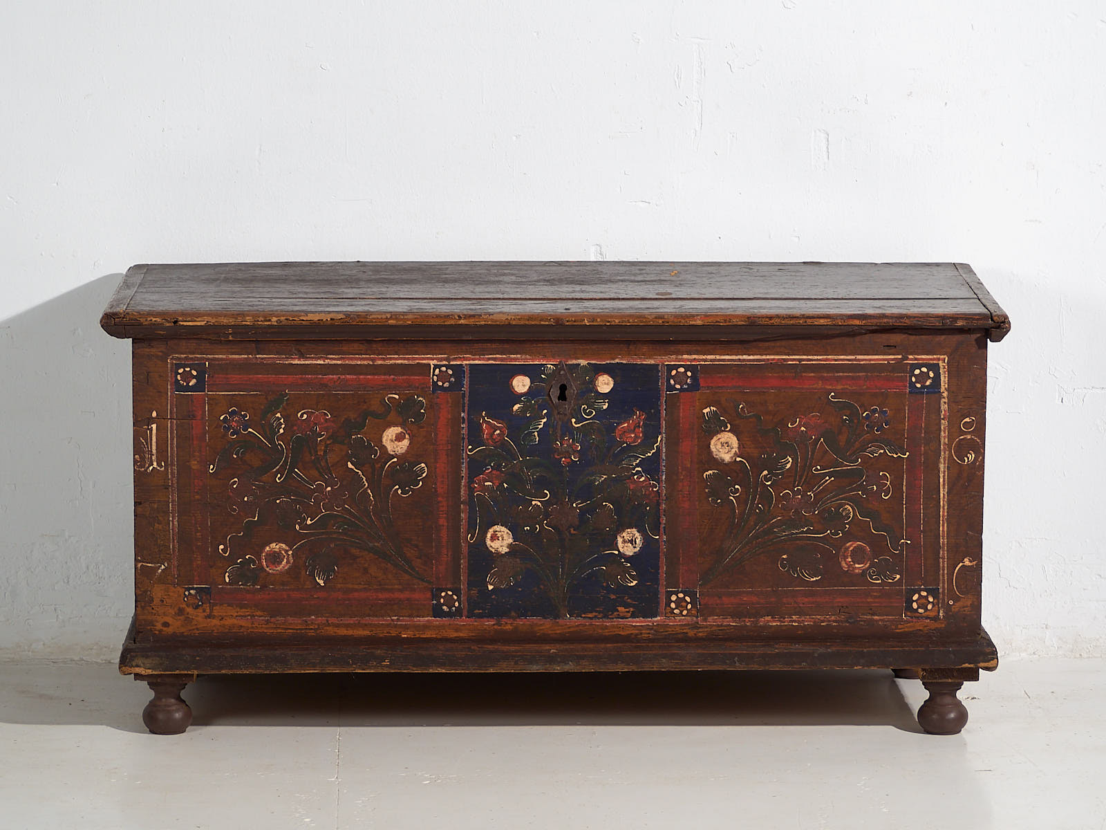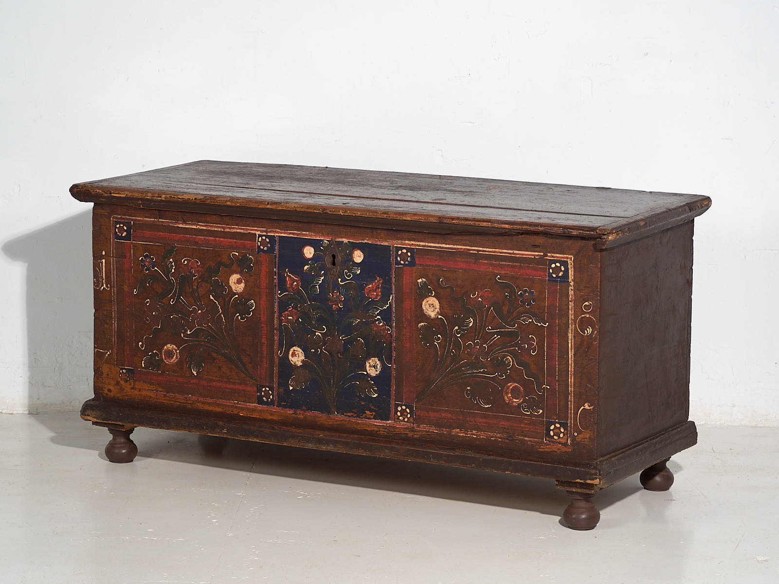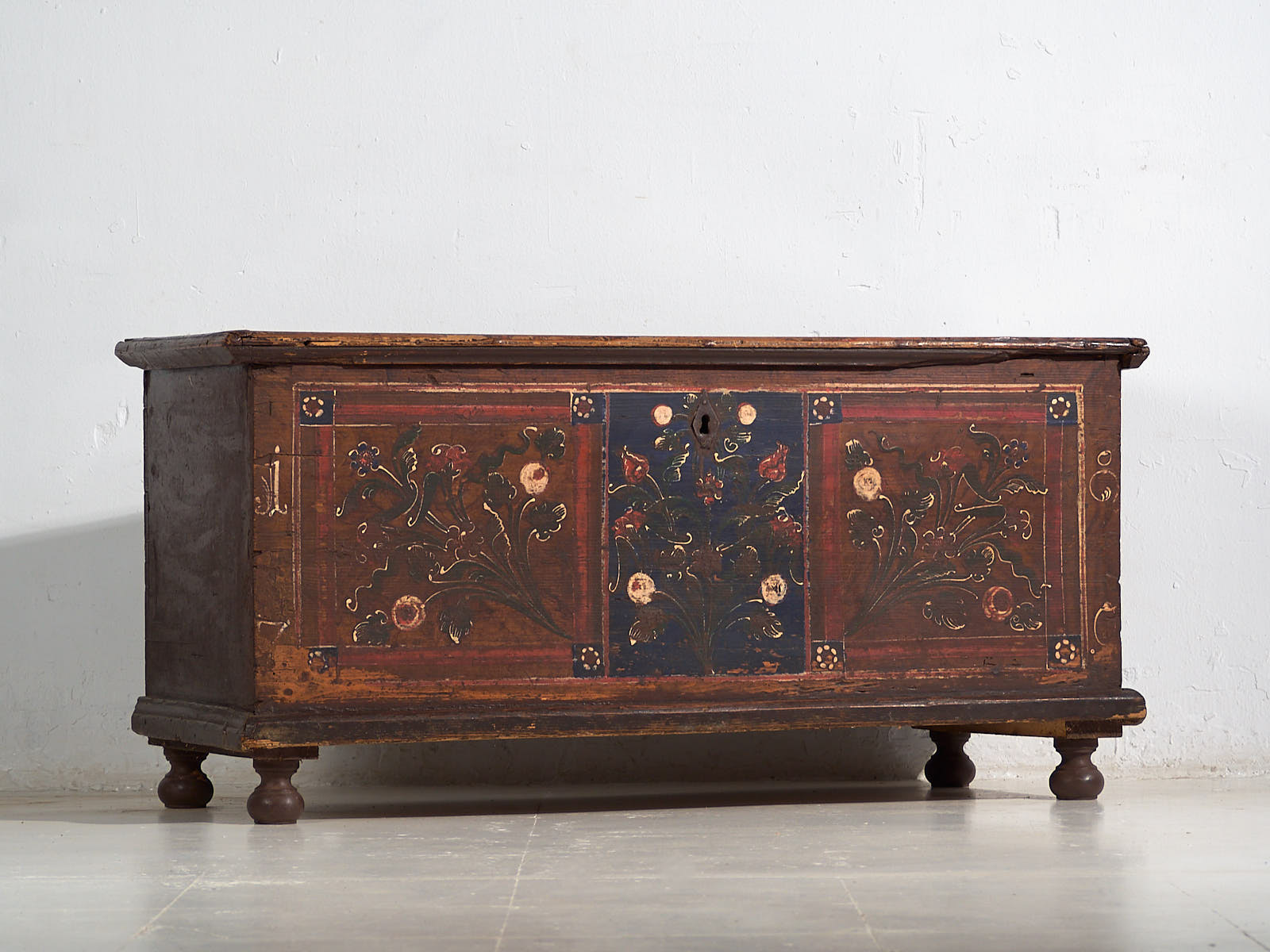Ancienne malle peinte avec des détails floraux datée de 1870.
