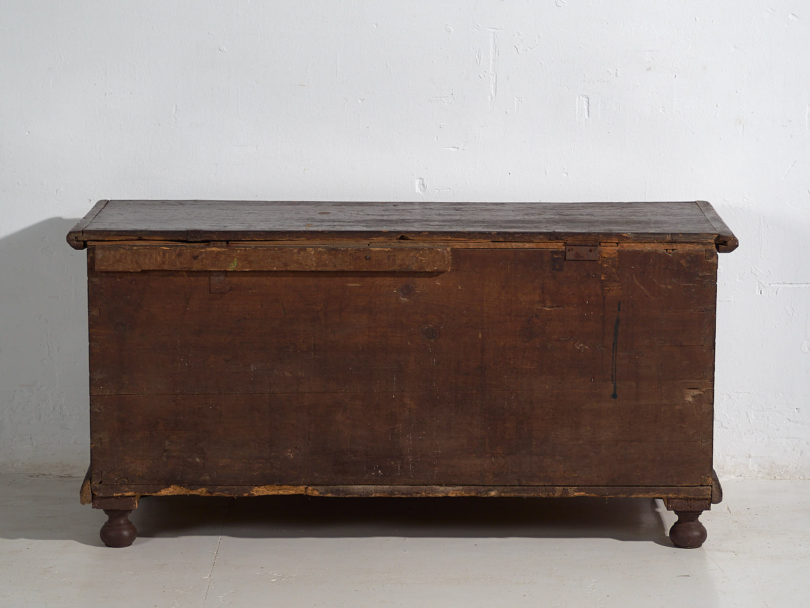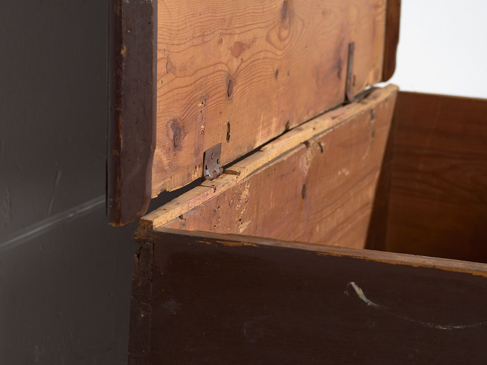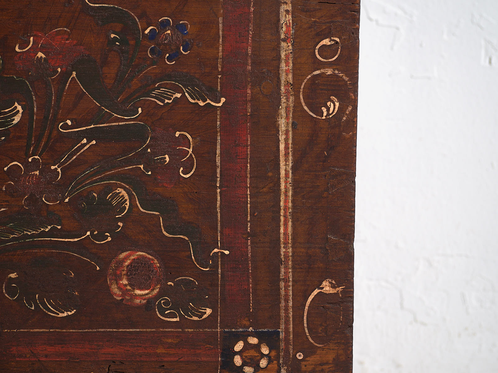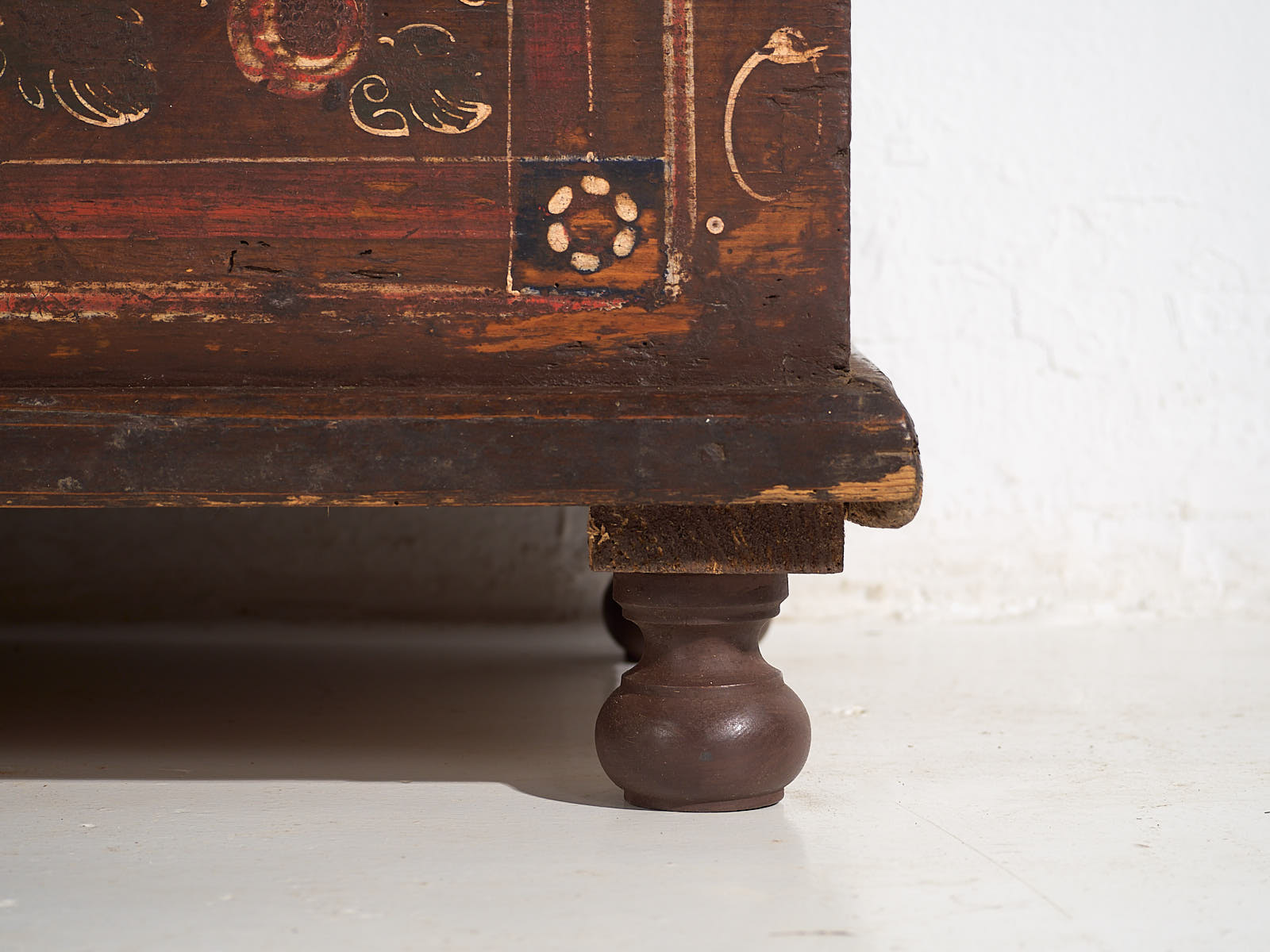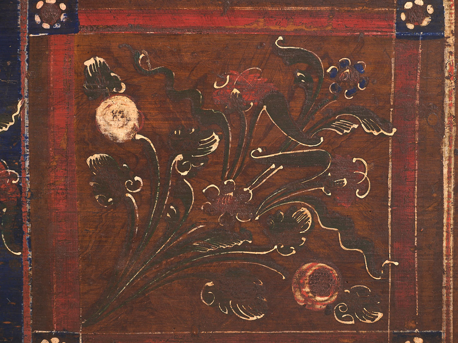 Ancienne malle peinte avec des détails floraux datée de 1870.