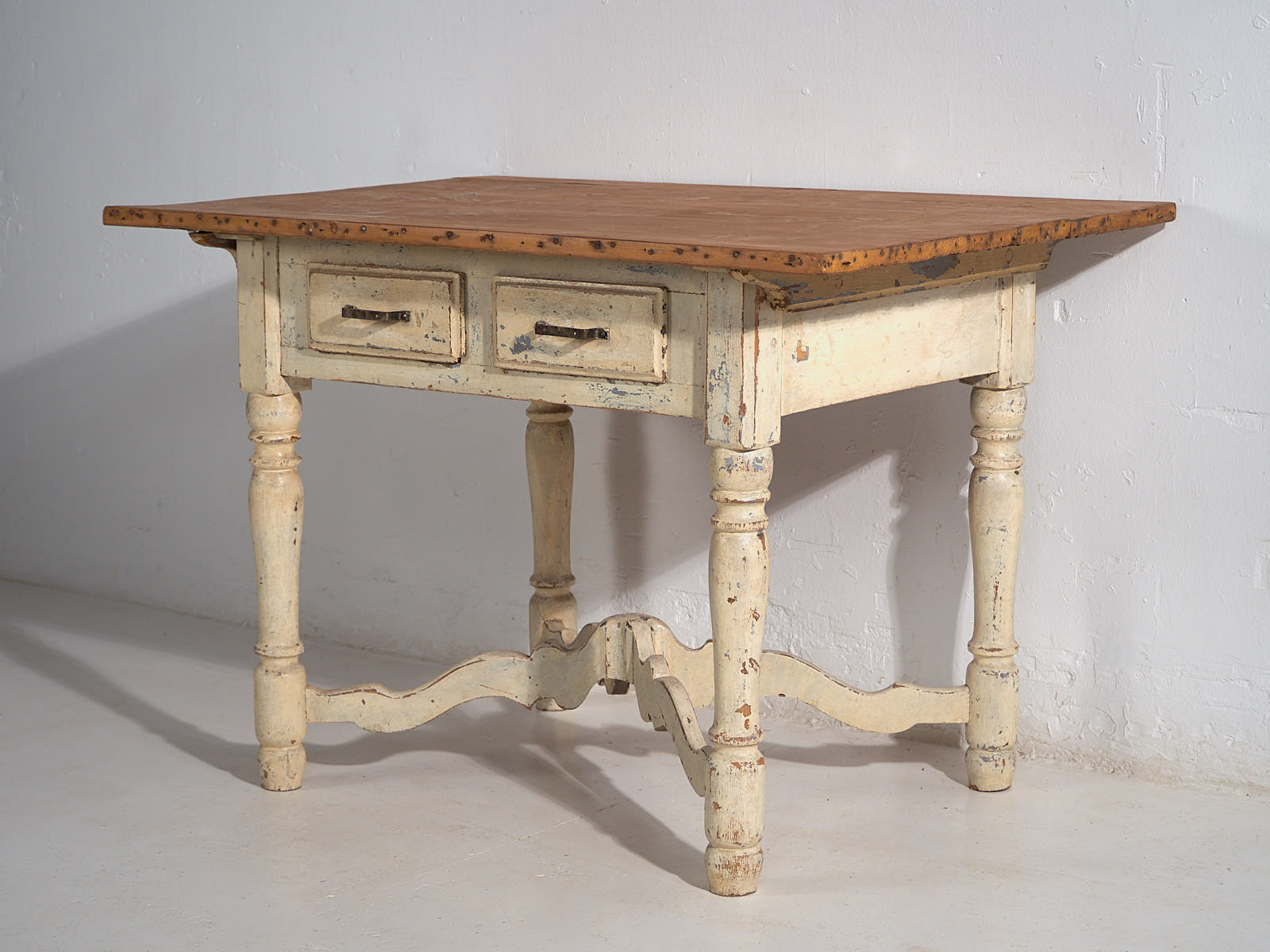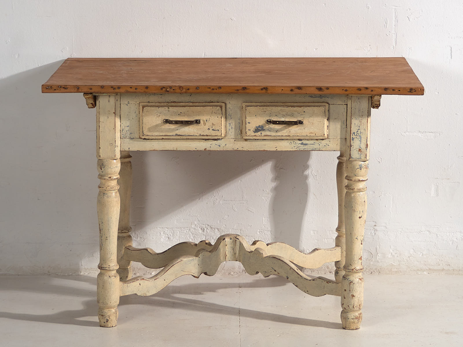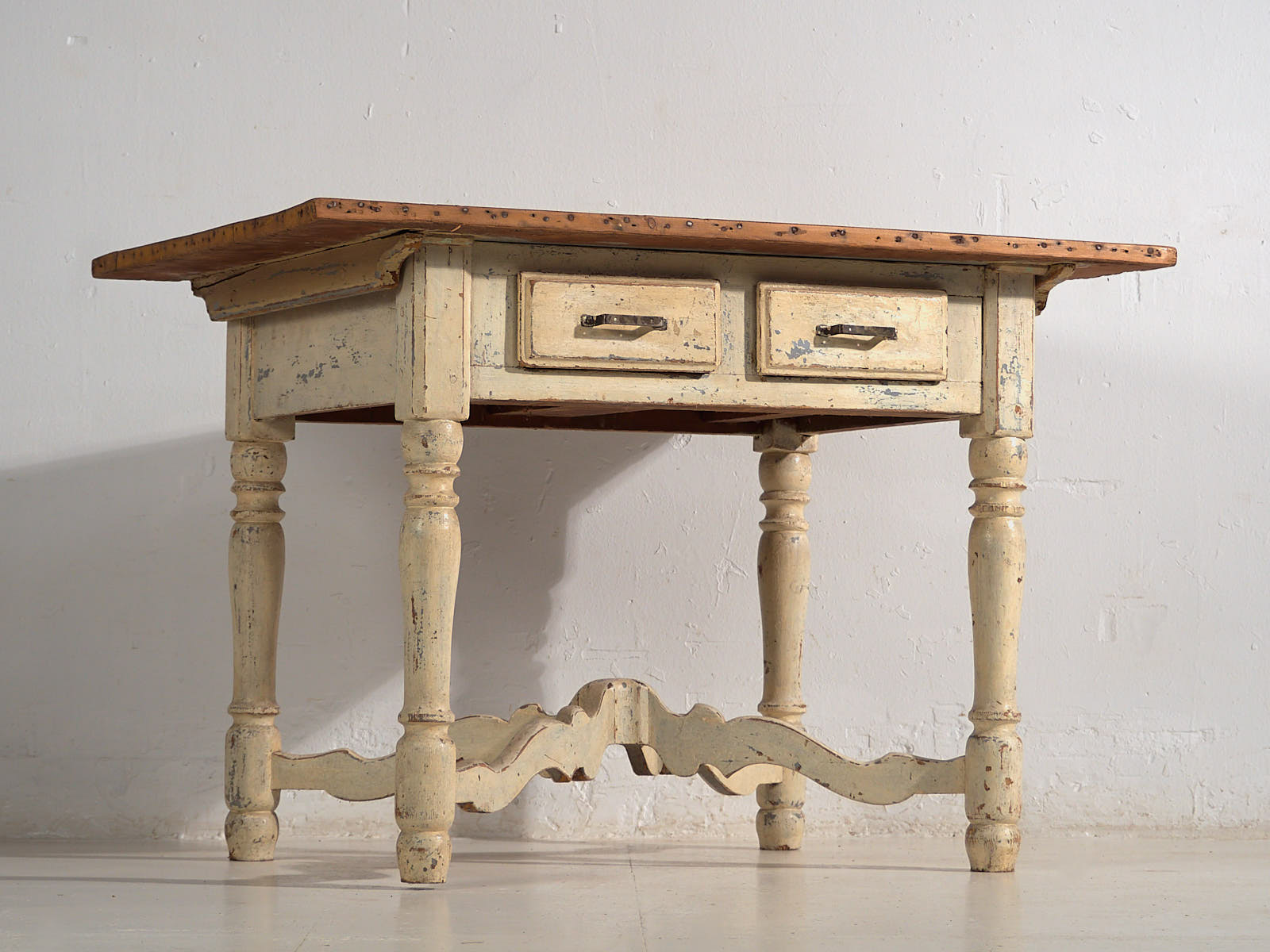 Table ancienne blancheen bois massif à deux tiroirs (France, vers 1900).