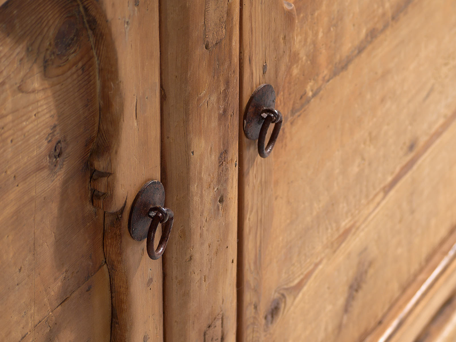 • Sus tiradores son los originales, tan antiguos como el mismo mueble. En general, es difícil encontrar muebles antiguos que conserven los tiradores originales ya que los tiradores metálicos se solían revender en momentos de necesidad económica de la familia.