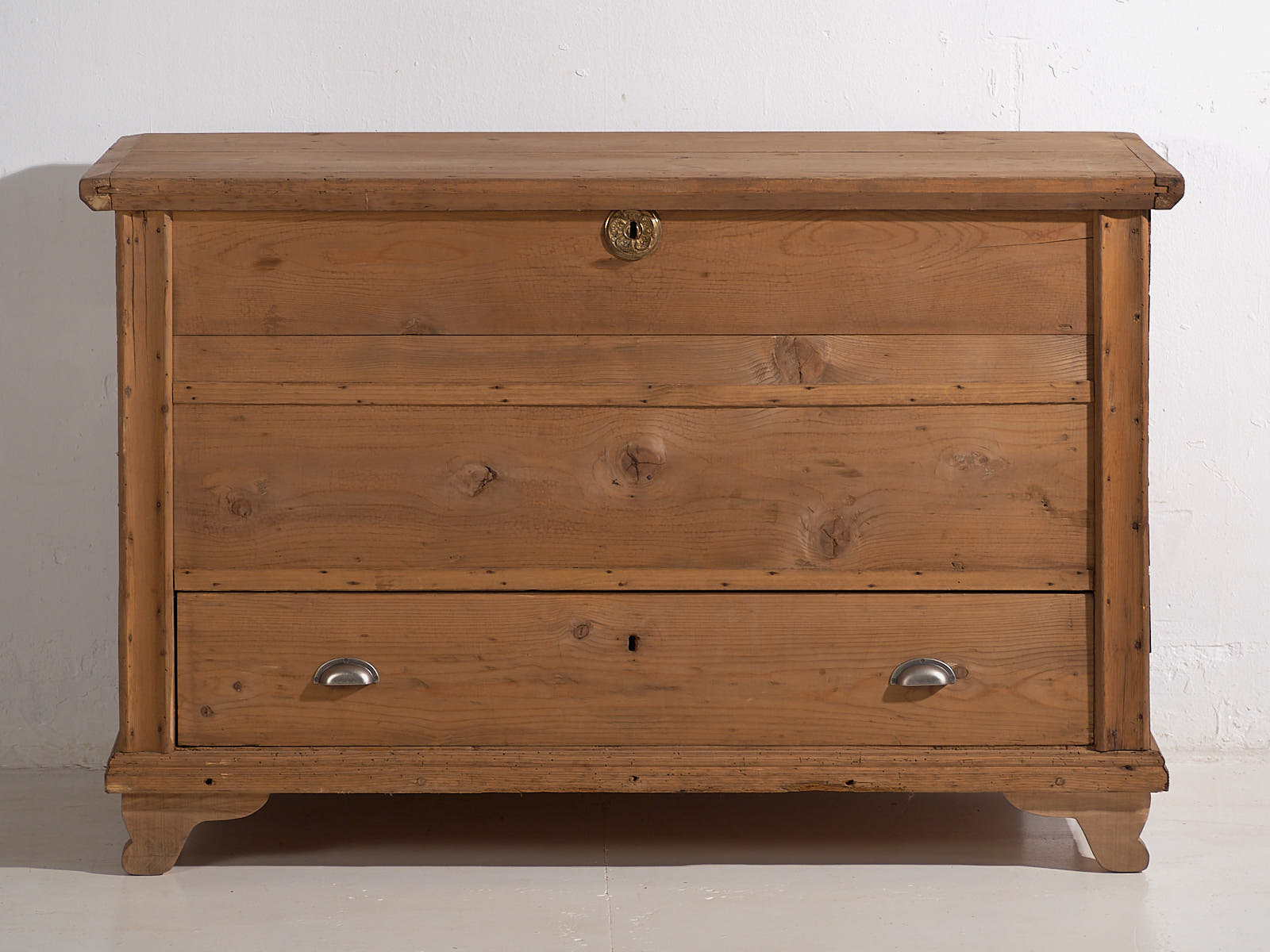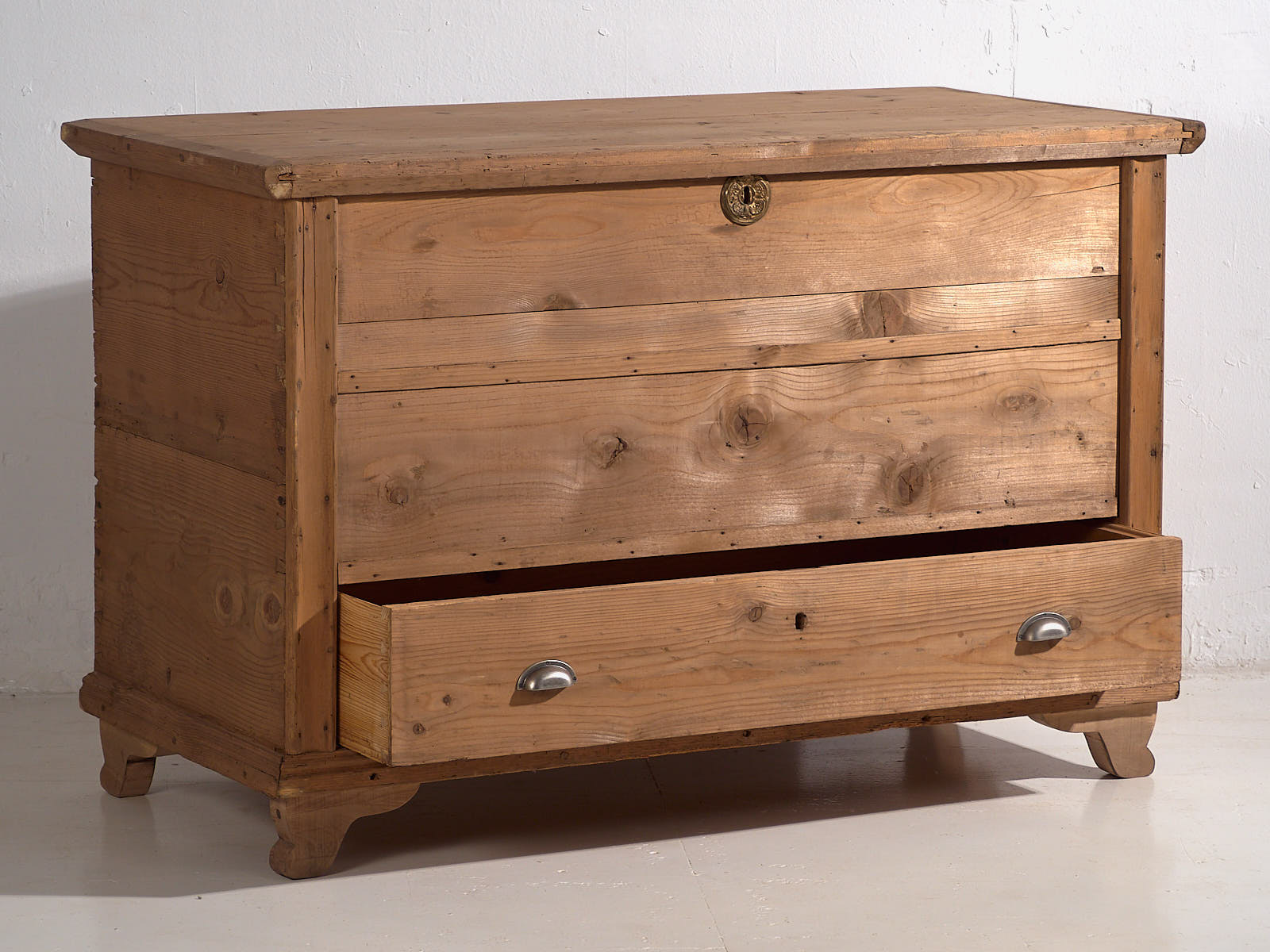 - Este mueble es literalmente un baúl con un cajón. Es decir, está compuesto por una parte superior en forma de baúl con gran espacio de almacenamiento y una parte inferior compuesta por un cajón grande.