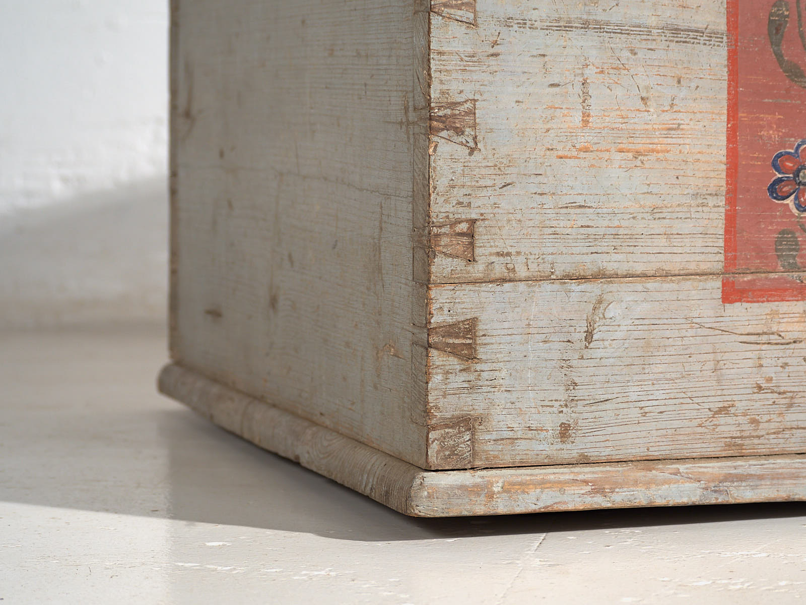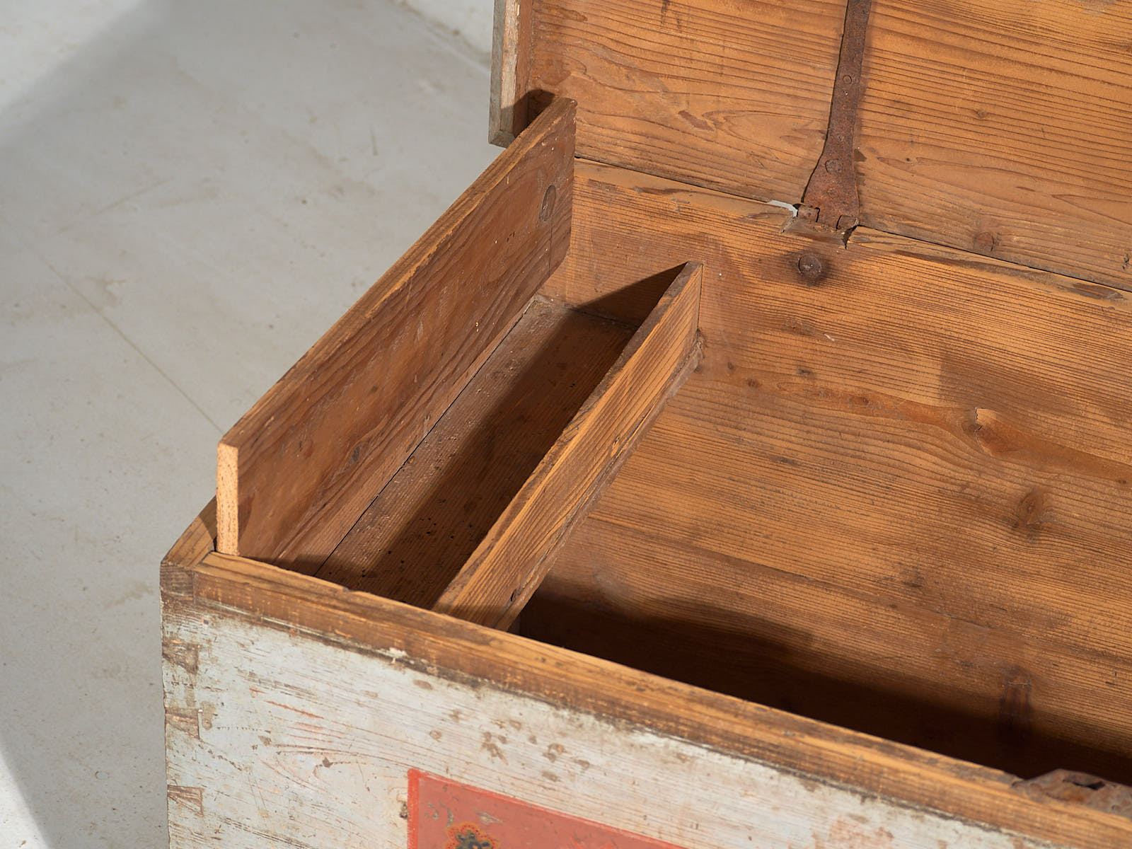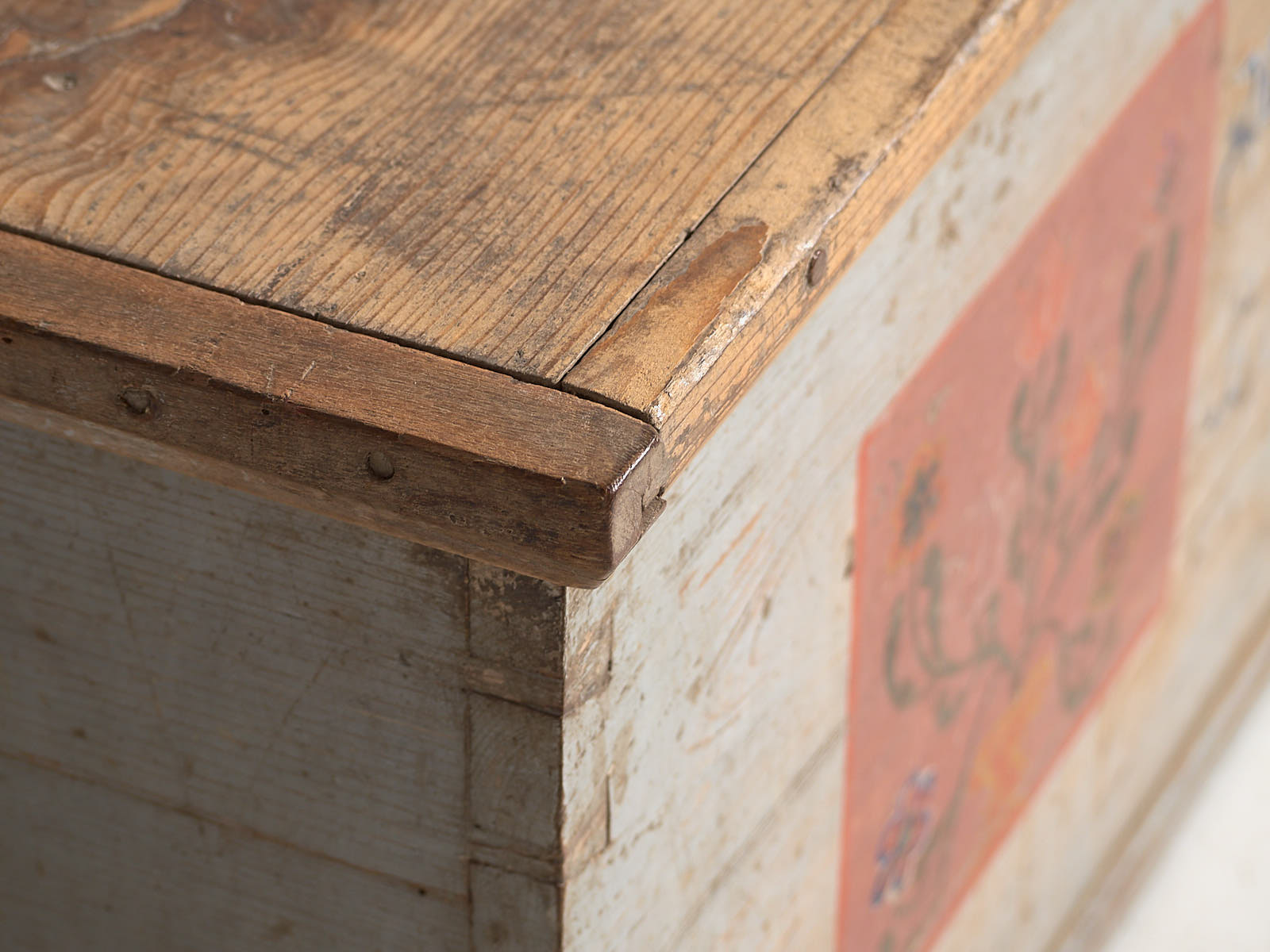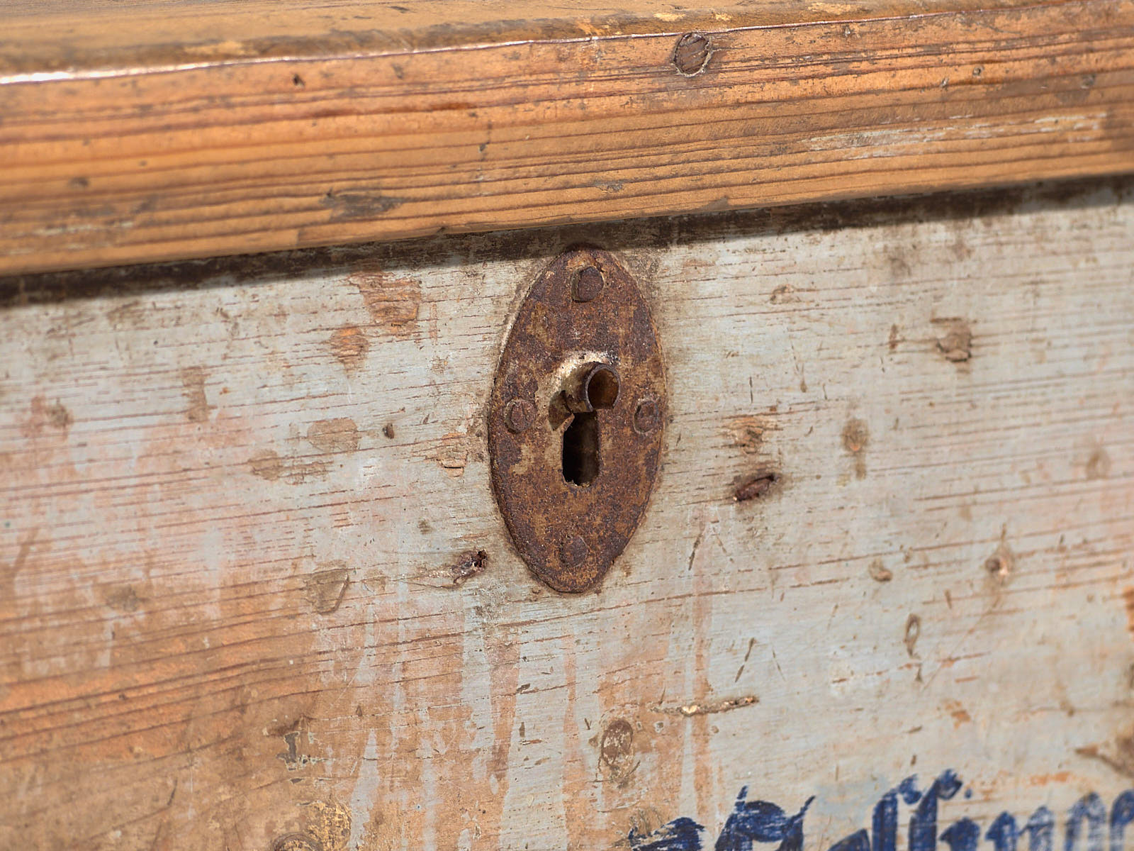 Baúl largo antiguo de color gris con detalles florales fechado Año 1878