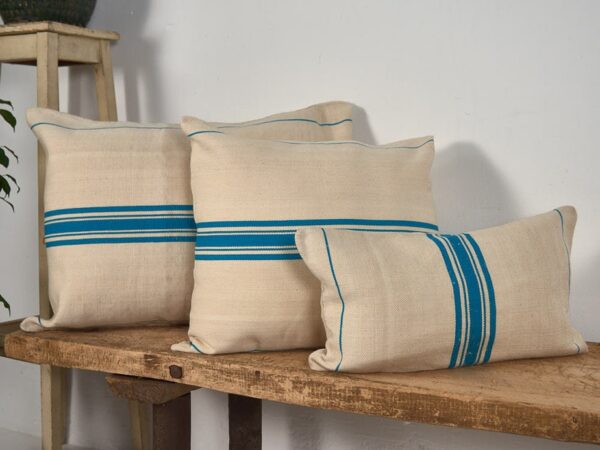 Cojín de lino antiguo de rayas azul turquesa confeccionado artesanalmente con sacos antiguos de harina.