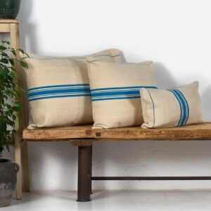 Cojín de lino antiguo de rayas azules y rojas confeccionado artesanalmente con sacos antiguos de harina.