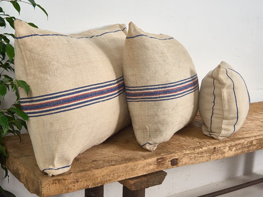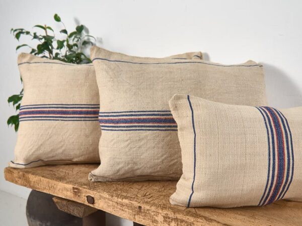 Cojín de lino antiguo de rayas azules y rojas confeccionado artesanalmente con sacos antiguos de harina.