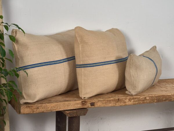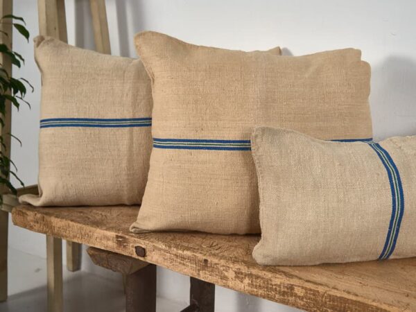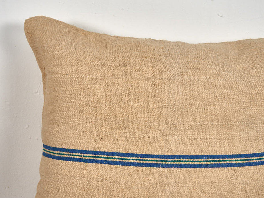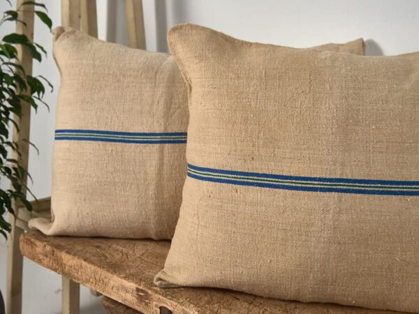 Cojín de lino antiguo de rayas azules y verdes confeccionado artesanalmente con sacos antiguos de harina.