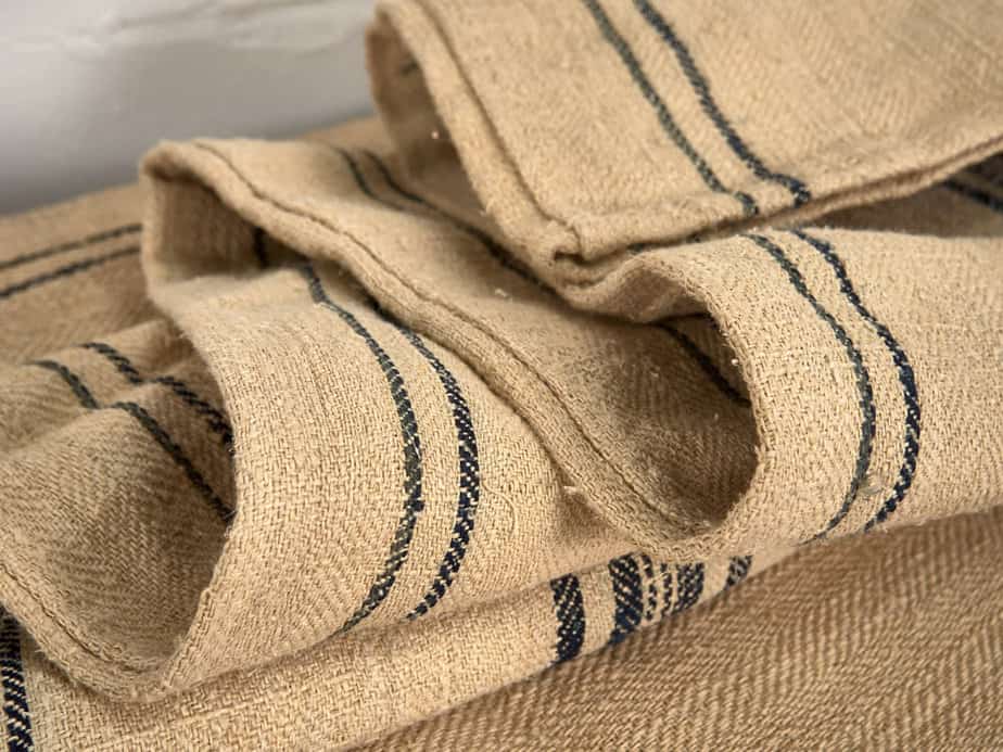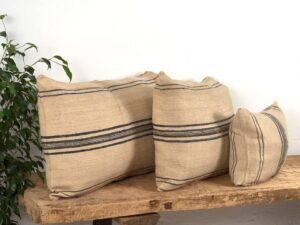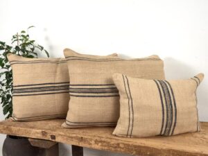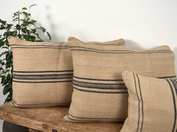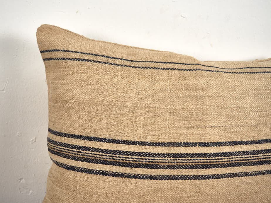 Cojín de lino antiguo de rayas color azul marino confeccionado artesanalmente con sacos antiguos de harina.