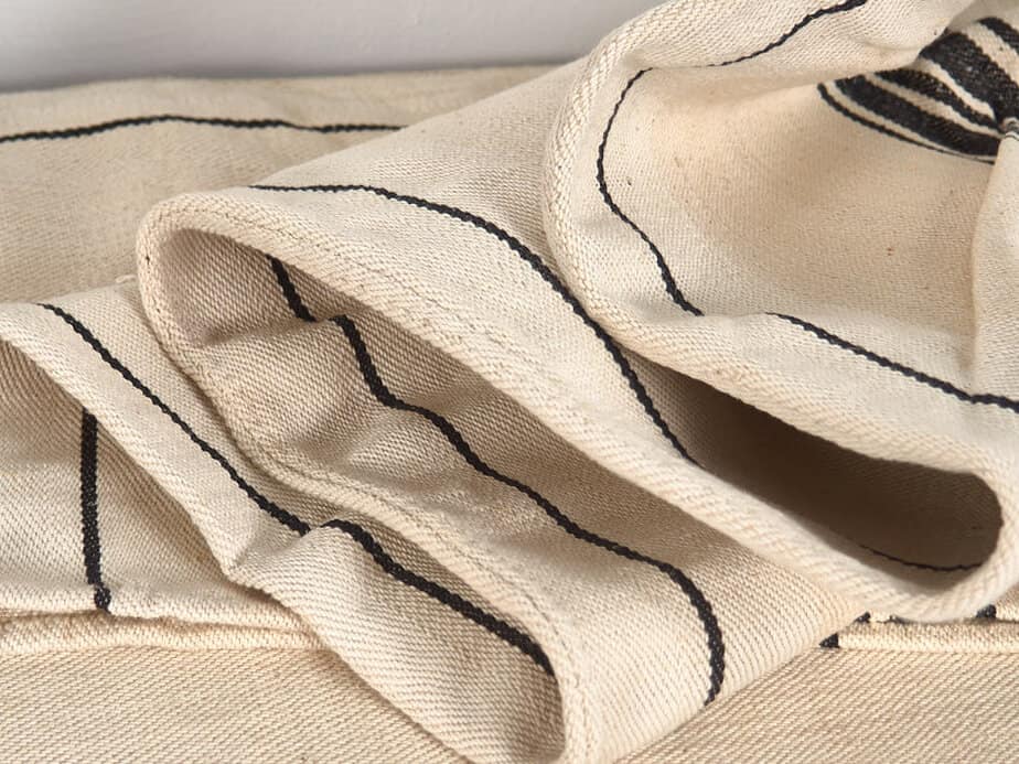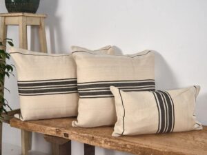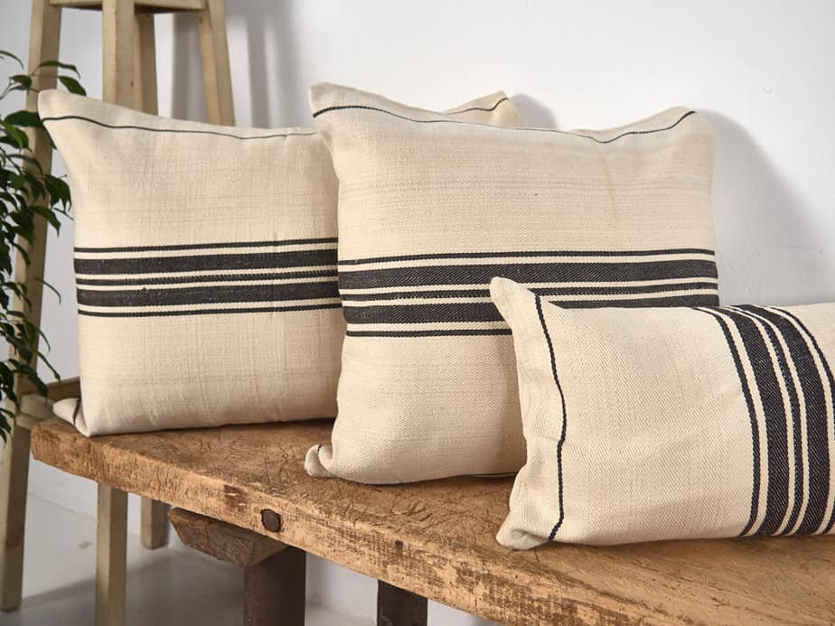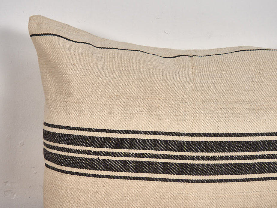 Cojín de lino antiguo  de rayas negras confeccionado artesanalmente con sacos antiguos de harina.