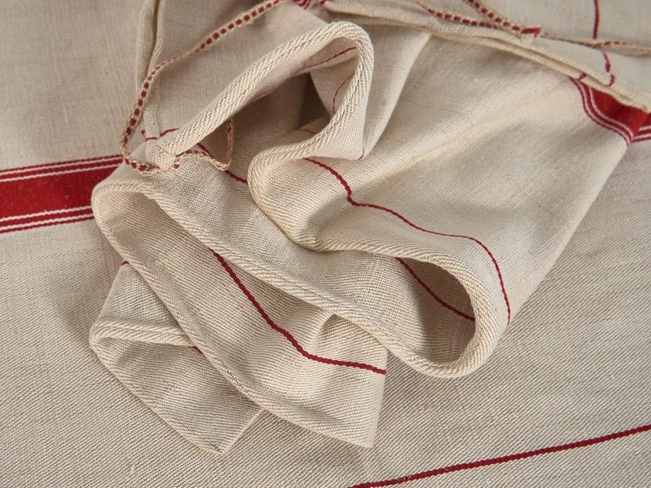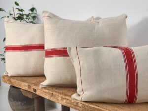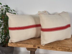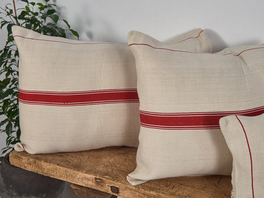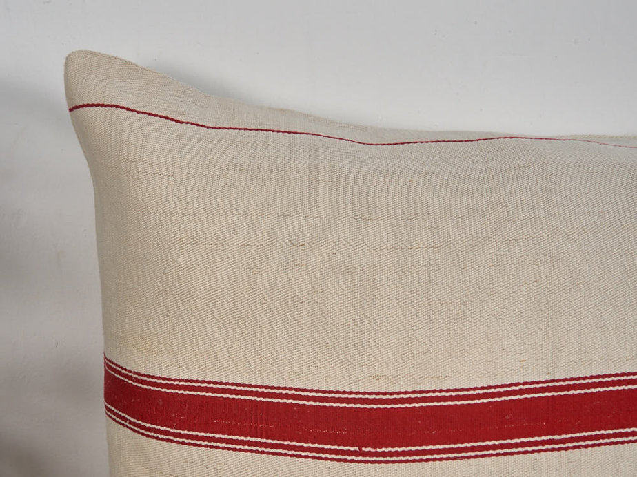 Cojín de lino antiguo  de rayas rojas confeccionado artesanalmente con sacos antiguos de harina.