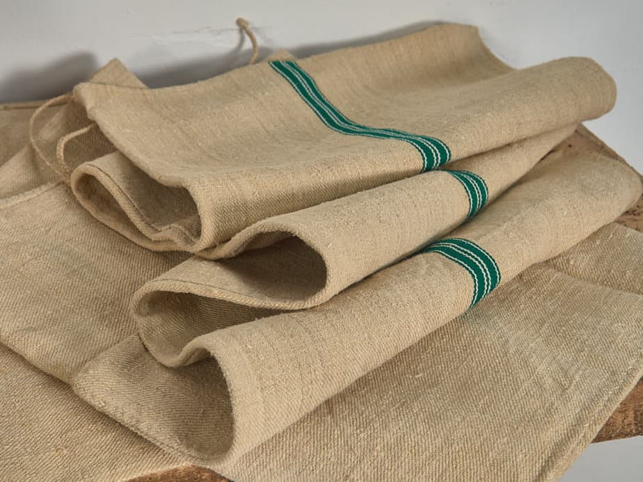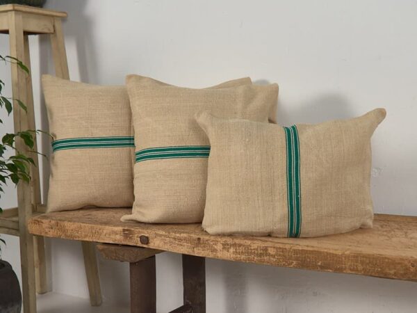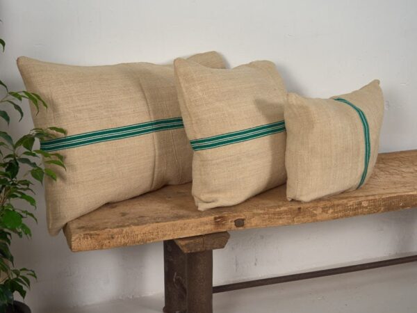 Cojín de lino antiguo de rayas verdes confeccionado artesanalmente con sacos antiguos de harina.