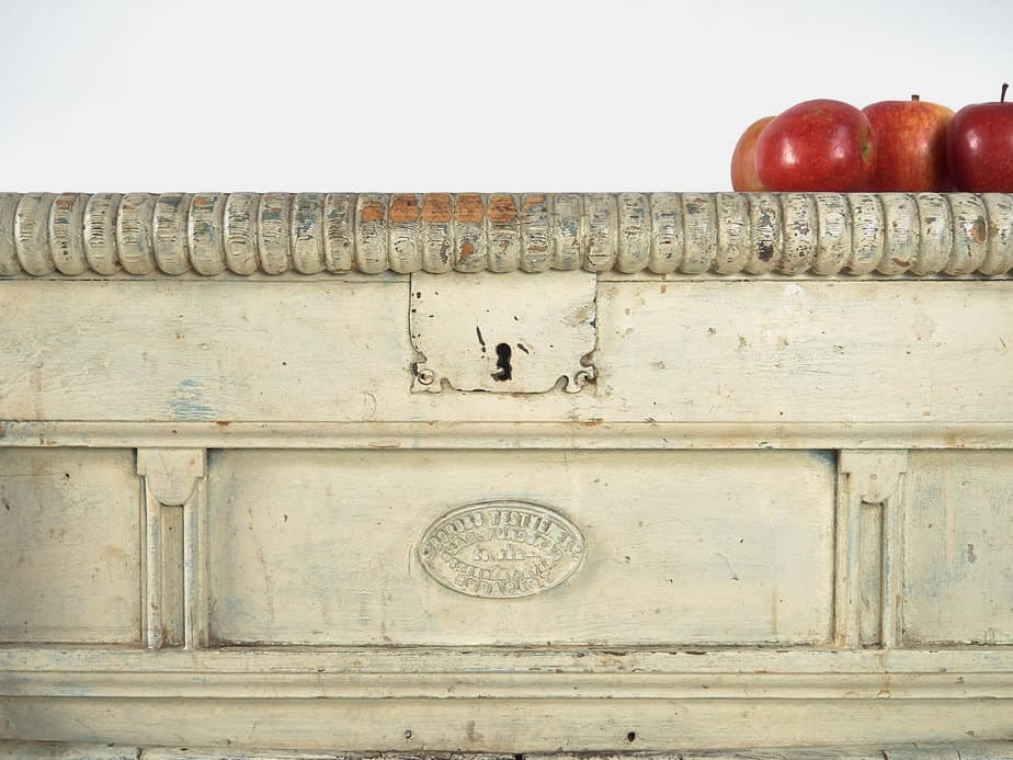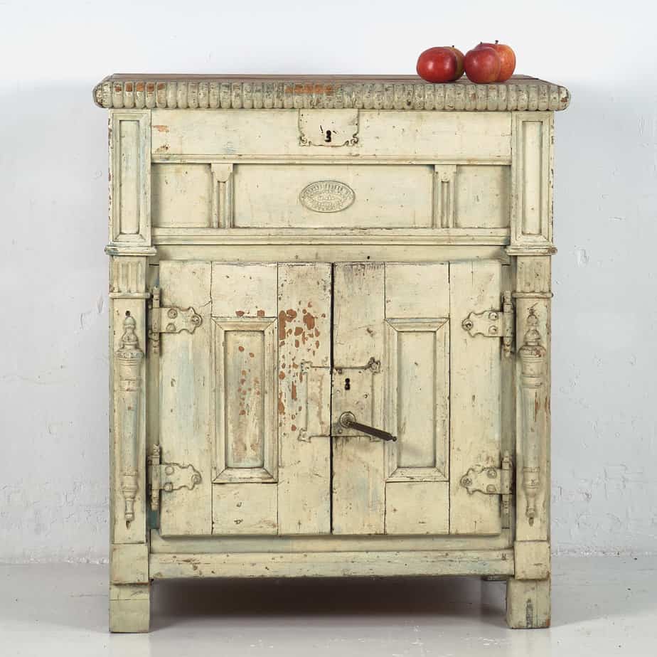 Encontramos esta antigua nevera en un anticuario en Austria. Fue fabricada en Budapest durante el período del Imperio Austro Húngaro. Está compuesta por un gran espacio interior que se abre con dos puertas de madera maciza de pino. En el interior se observa una estructura metálica ideal para conservar mejor el frío.