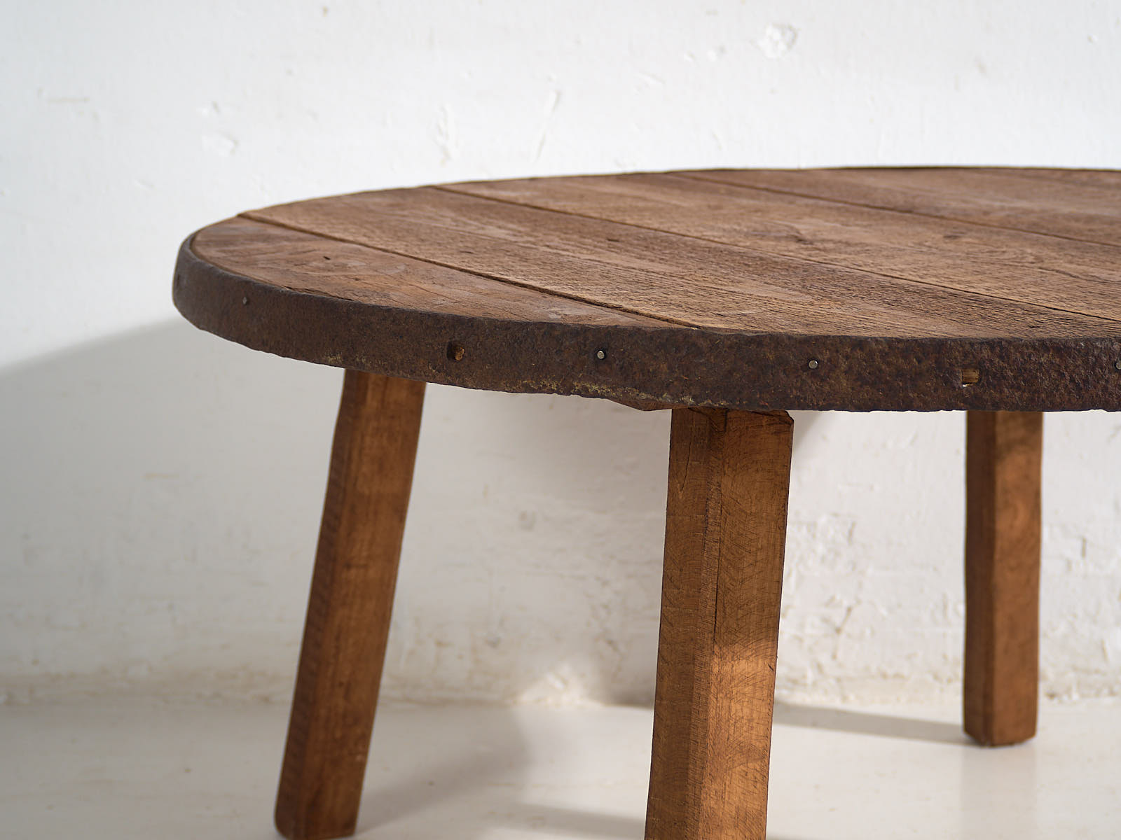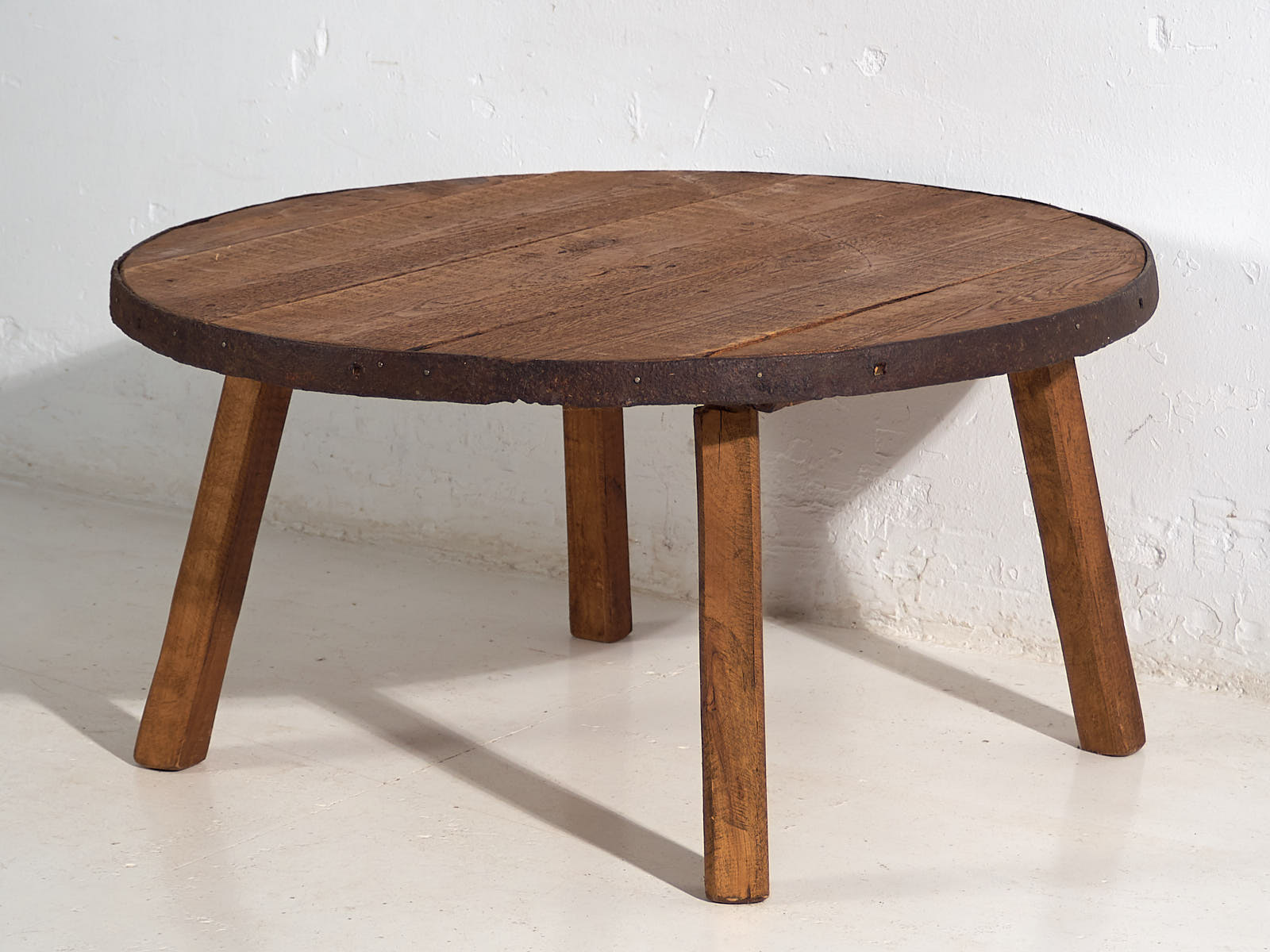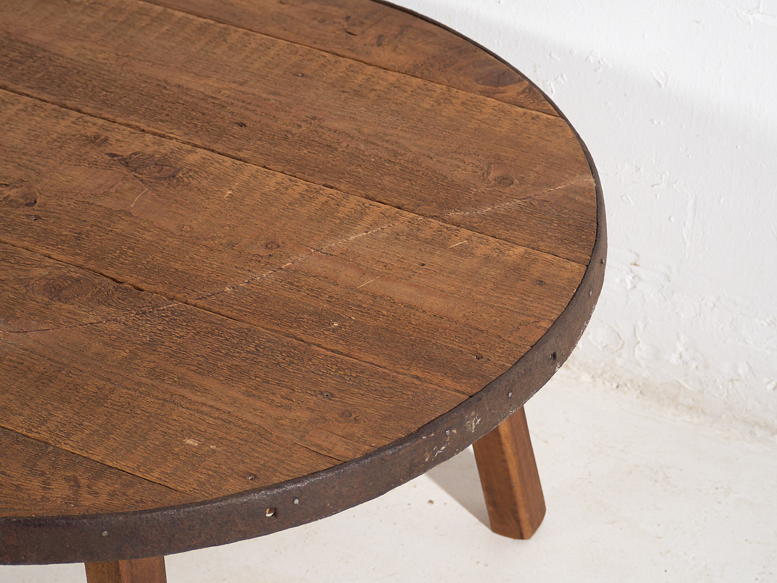 Nuestra mesa de centro redonda es una pieza única construida con madera maciza antigua y las partes metálicas de antiguas ruedas de carruajes. Destaca por: