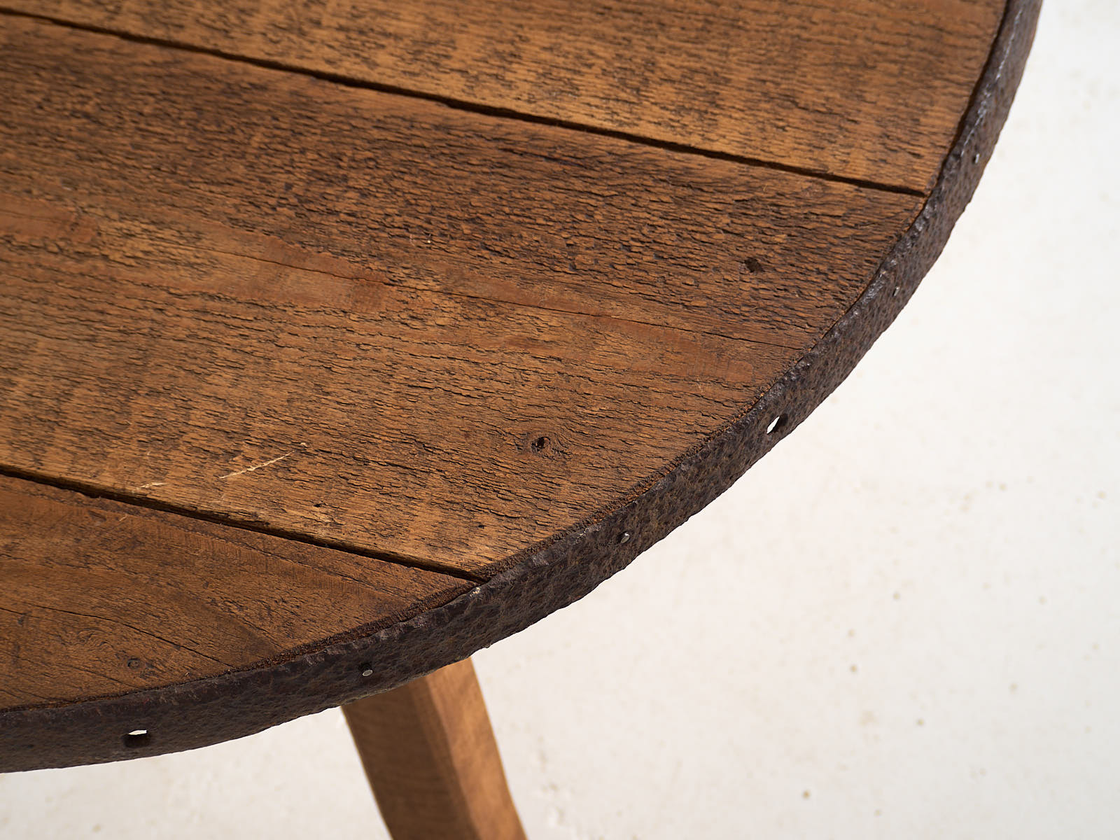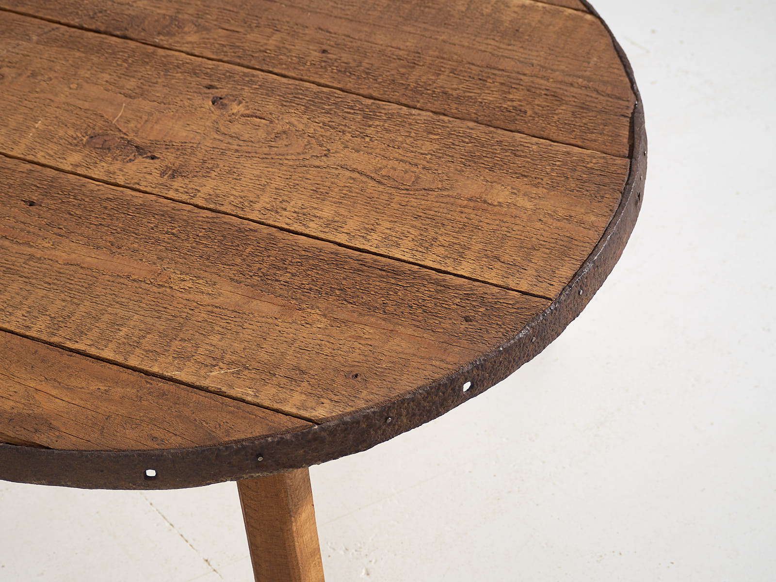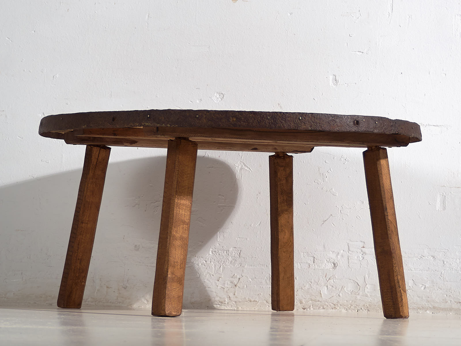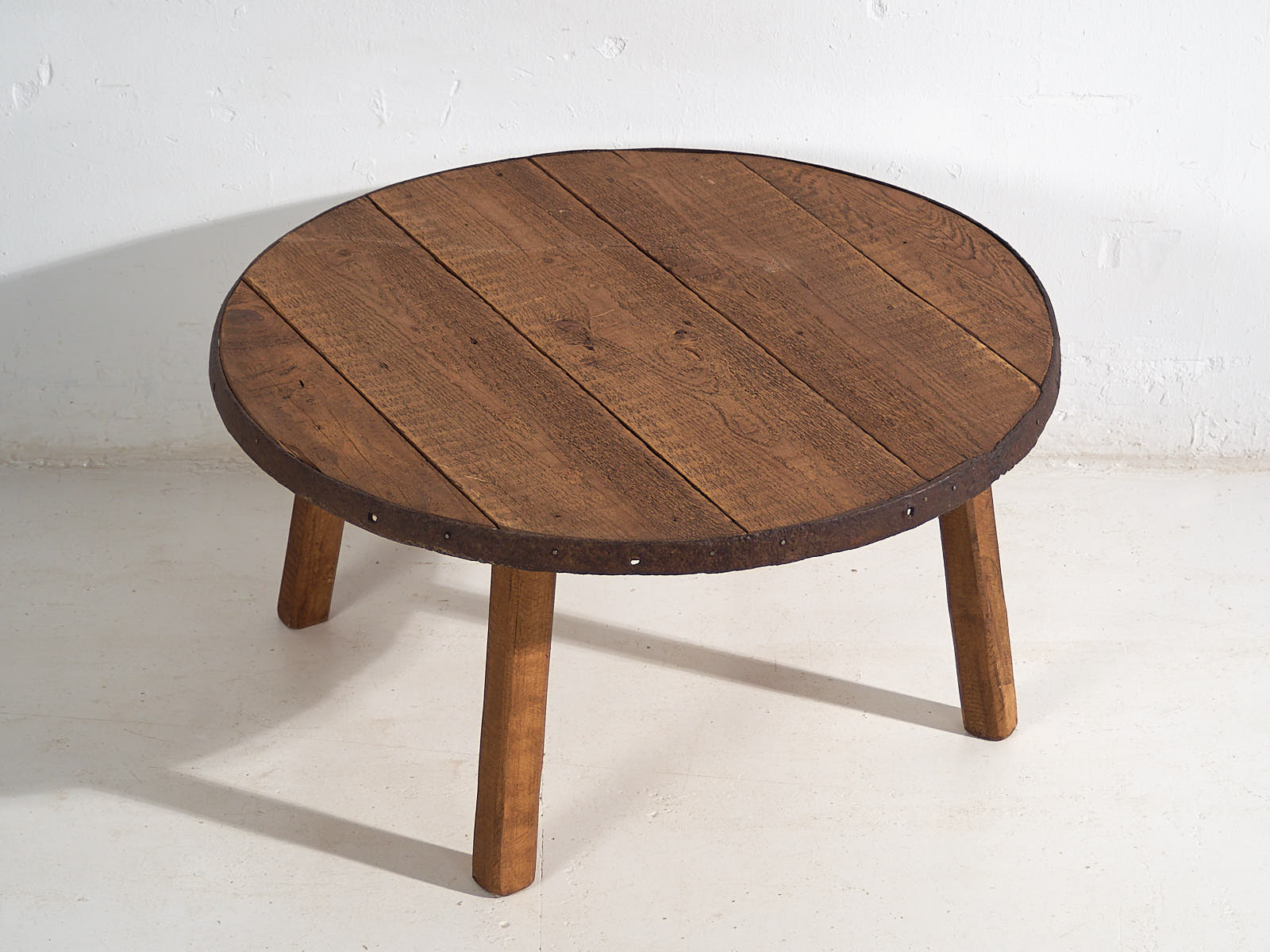 Nuestra mesa de centro redonda es una pieza única construida con madera maciza antigua y las partes metálicas de antiguas ruedas de carruajes. Destaca por: