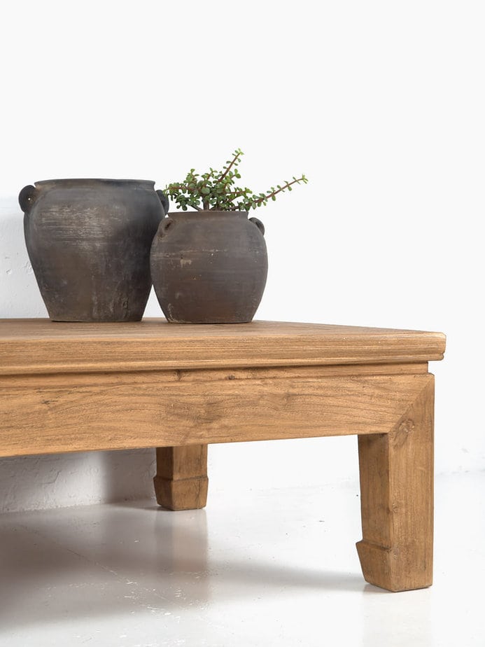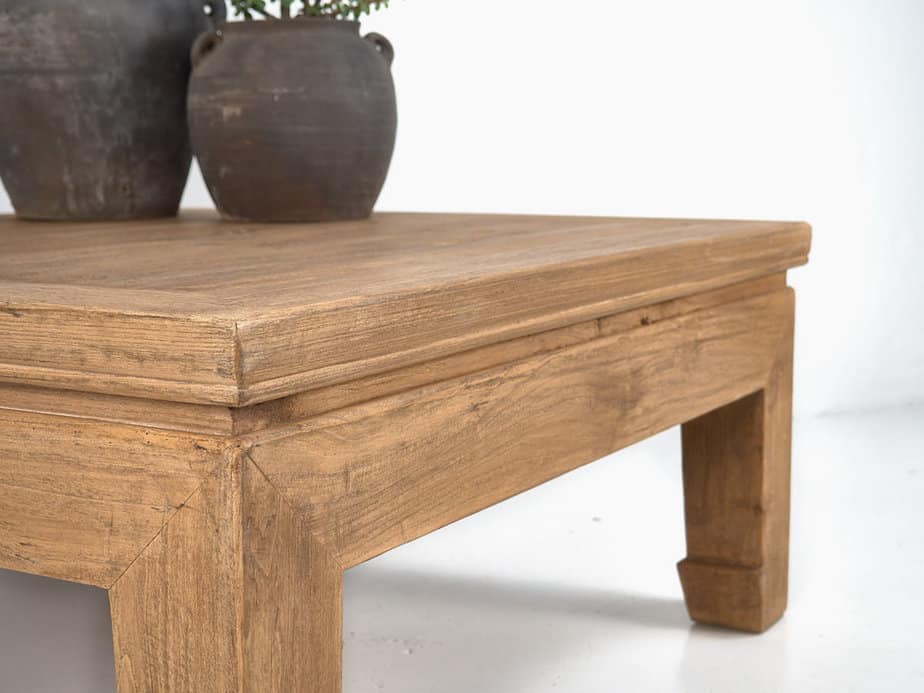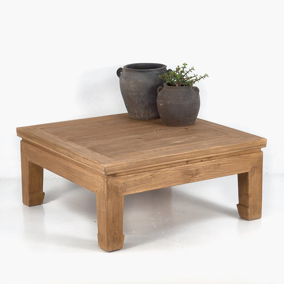 Esta mesa kang de centro cuadrada de madera antigua es de madera en color madera natural con tonalidades doradas y puede ser la mesa de centro donde tomar vuestro café en el comedor o en la sala de estar.