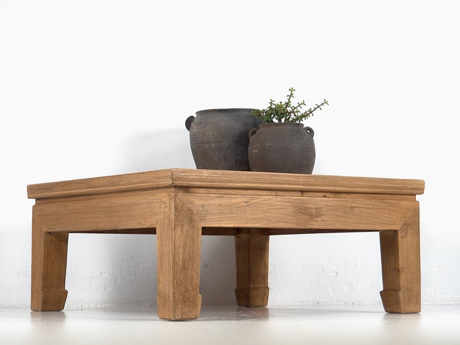 Mesa kang de centro cuadrada de madera antigua maciza de olmo.