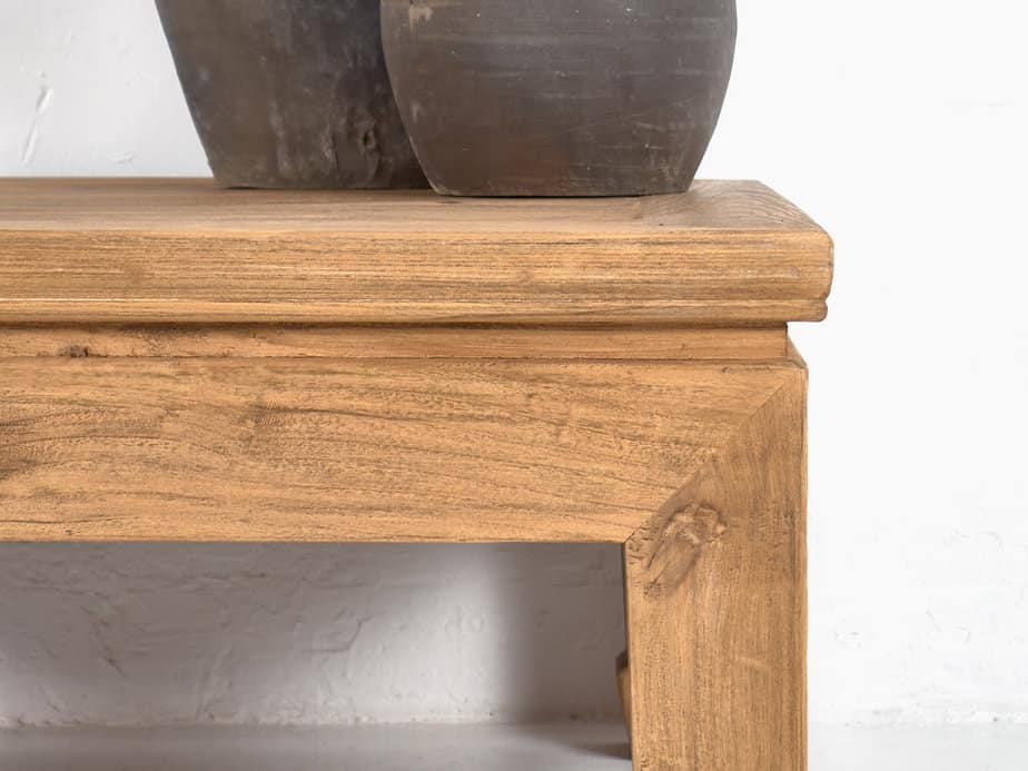 Nuestra mesa de centro la hemos construido con madera antigua de más de cien años de antigüedad. Hemos utilizado madera maciza de olmo antigua de más de cien años de antigüedad. Con la idea en mente de construir una mesa baja de centro que mantenga el tipo de construcción de antaño, construimos varios ejemplares con dimensiones parecidas aunque no hay ni una pieza igual. Cada pieza de madera antigua ha sido restaurada con varios procesos de restauración.