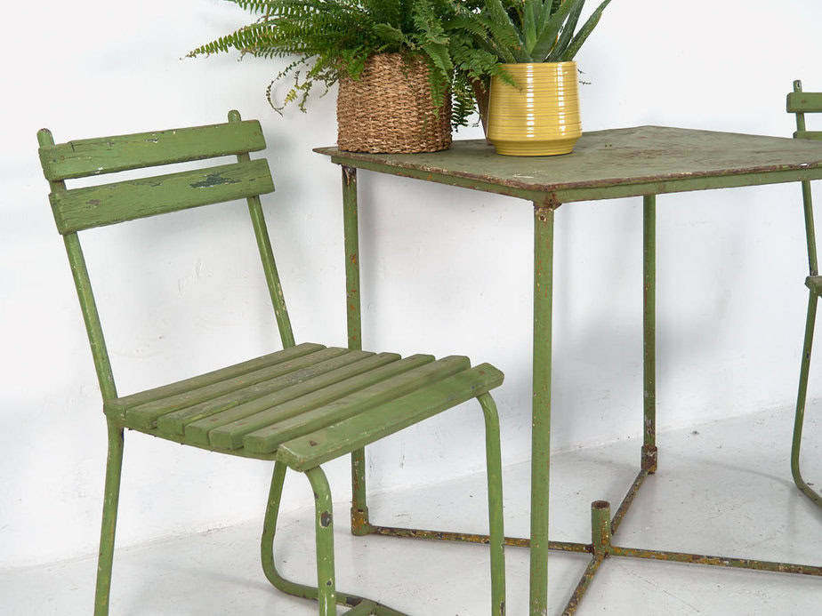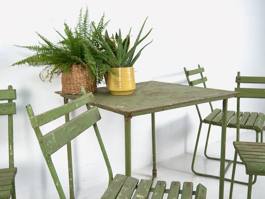 2. Su mesa cuadrada de metal combinada con hierro y madera de las sillas de jardín llaman al encanto y a un estilo único.